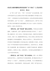 政法队伍教育整顿法院党组担纲“五个角色”(人民法院党组书记、院长)在“两个大局”交织、“两个一百年目标”交汇的新时期,党中央审时度势作出在全国政法系统开展队伍教育整顿工作的重大决定,开辟了一条锻造新时代法院铁军的新路径,各级法院党组要发扬彻底的革命精神,当好“五个角色”,以最高的政治站位、最严的工作纪律、最有力的举措抓好队伍教育整顿,努力打造一支党和人民信得过、靠得住、能放心的法院队伍。一要明方略,当好“领头雁”落实主体责任。开展政法队伍教育整顿,关键看领导,重中之重是要压实院党组主体责任,“一把手”要认真履行第一责任人职责,拧紧党组责任链条,构建齐抓共管的责任体系。党组一班人要旗帜鲜明讲政治...