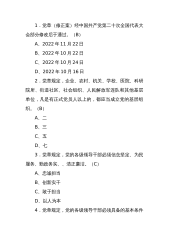 2023最新《D章》应知应会知识竞赛(100题)1.D章(修正案)经中国共产党第二十次全国代表大会部分修改后于通过。(B)A、2022年11月22日B、2022年10月22日C、2022年10月24日D、2022年10月16日2.D章规定,企业、农村、机关、学校、医院、科研院所、街道社区、社会组织、人民解放军连队和其他基层单位,凡是有正式党员人以上的,都应当成立党的基层组织。(B)A、二B、三C、五D、七3.D章规定,党的各级领导干部必须信念坚定、为民服务、勤政务实、、清正廉洁。(C)A、忠诚担当B、创新实干C、敢于担当D、以人为本4.D章规定,党的各级领导干部必须具备的基本条件之一是:具有履...