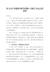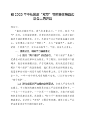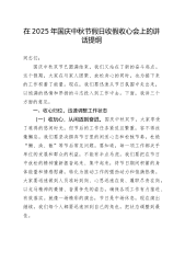 在2025年中秋国庆“双节”节前集体廉政谈话会上的讲话同志们:“廉风劲拂佳节至,清气长盈事业兴。”中秋、国庆“双节”将至,这是阖家团圆、举国欢庆的美好时刻,也是对我们廉洁自律的重要考验。今天,我们召开这次节前集体廉政谈话会,就是要给大家打打“预防针”、念念“紧箍咒”,确保大家过一个风清气正、欢乐祥和的节日。下面,我讲几点意见。一、提高站位,明晰节日廉政要义(一)践行“两个维护”的试金石。“两个维护”是我们党最根本的政治纪律和政治规矩。节日期间,各种诱惑和干扰增多,能否保持清醒头脑,严守纪律规矩,是对我们是否真正做到“两个维护”的直接检验。我们要从讲政治的高度出发,把思想和行动统一到党中央的决策部署上来,在节日期间的一言一行、一举一动中体现对党的绝对忠诚,以实际行动践行“两个维护”。(二)深化...