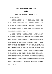 2021年小学教师中秋节国旗下讲话(5篇)2021年小学教师中秋节国旗下讲话(一)老师们,同学们:今天我讲话的题目是“中秋,怀一颗感恩的心”。秋浓了,月圆了,又一个中秋快到了!农历8月15,就是我国的传统节日--中秋节。中秋节,处在一年中秋季的中期,故名“中秋”,它仅次于春节,是我国第二大传统节日。中秋的月最圆,中秋的月最明,中秋的月最美,所以又被告称为“团圆节”。金桂飘香,花好月圆,在这美好的节日里,人们赏明月,吃月饼,走亲访友...无论什么形式,都寄托着人们生活的无限热爱和对美好生活的向往。中秋是中华瑰宝之一,有着深厚的文化底蕴。中国人特别讲究亲情,特别珍视团圆,中秋尤甚。中秋是一个飘溢亲...