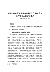 海阳市副市长张金富在做好“双节”期间安全生产会议上的讲话提纲2021年09月30日同志们:“中秋节”、“国庆节”将之,为做好“双节”期间安全生产工作,我强调几个方面问题。一是提高思想认识,强化责任落实历年来节假日都是事故的频发期,尤其是“双节”假期间隔短、时间长,各行业生产、经营、管理与日常存在较大差异,市民出行意愿增大,极易诱发各类安全生产事故。各镇区街道和行业部门要进一步提高责任意识,认真落实属地管理责任、部门监管责任,对本辖区、本行业领域重点单位、不放心单位进行安全生产实地检查,对排查的问题隐患要落实责任、采取得力措施“真改、快改”,坚决杜绝和遏制各类事故发生。要加强对安全隐患的排查和整...