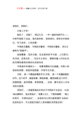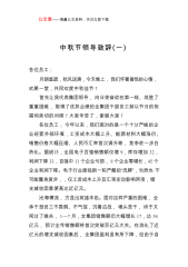 公文堂——海量公文资料,关注立即下载中秋节领导致辞(六)同志们:值此中秋佳期节来临之际,我代表厂党政班子向你们,并通过你们向全厂员工及家属致以节日的问候!对大家在工作中所付出的艰辛努力表示诚挚的谢意,感谢你们对班子的理解和支持。回顾年初到现在的短短8个月,在全厂员工的共同努力下,我厂各项工作都有了较长足的进步,厂党政班子感到非常满意。从理念文化贯彻上讲,“****管理”理念已经深入人心,管理人员对“十大工作理念”的核心和内涵已较深入理解,班子成员的“四种意识”已经基本确立,员工的综合素质大大提高,全厂从上到下形成了一种主动加压、昂然向上的士气。从经营管理上讲,本着开源节流,增强长远创效能力的原...