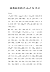 在区委2026年党建工作会议上的讲话(精品)同志们:今天,我们召开区委2026年党建工作会议,主要任务是深入贯彻落实党中央决策部署和市委工作要求,总结回顾过去一年全区党建工作,分析当前形势,安排部署2026年重点任务。刚才,相关部门作了工作汇报,讲得很具体,我完全同意,请大家认真抓好落实。2026年是中国共产党成立105周年,是十五五规划开局之年。做好今年党建工作,意义非凡,责任重大。过去一年,全区各级党组织牢固树立抓好党建是最大政绩的理念,扎实开展贯彻中央八项规定精神学习教育,压紧压实管党治党政治责任,以高质量党建推动全区各项事业发展取得新进展新成效。根据统计数据显示,2025年全区地区生产总值同比增长百分之六点五,居民人均可支配收入增长百分之四点八,这些成绩的取得,离不开党建工作的坚强引...