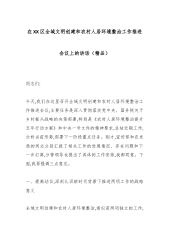 在2025年度全区全域文明创建和农村人居环境整治工作推进会议上的讲话同志们:今天,我们在这里召开全域文明创建和农村人居环境整治工作推进会议,主要任务是深入贯彻落实党中央、国务院关于乡村振兴战略的决策部署,特别是《农村人居环境整治提升五年行动方案》和中央一号文件的精神要求,总结近期工作,分析当前形势,部署下一阶段重点任务。刚才,宣传部和农发局的同志分别汇报了相关工作的进展情况、存在问题和下一步打算,分管领导也提出了具体的工作安排,我都同意。下面,我再强调三点意见。一、提高站位,深刻认识新时代背景下推进两项工作的战略意义全域文明创建和农村人居环境整治,看似是两项独立的工作,实则内在统一、相辅相成,共同构成了推进我区高质量发展和乡村全面振兴的“一体两翼”。这既是关乎发展全局的战略任务,也是顺应人民...