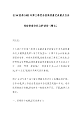 在XX县委2025年第三季度全县高质量发展重点任务总结复盘会议上的讲话(精品)同志们:今天我们召开第三季度全县高质量发展重点任务总结复盘会议,主要任务是深入学习贯彻党的二十届三中全会精神,全面落实省委、市委决策部署,总结盘点前三季度工作成效,分析研判当前形势,安排部署第四季度重点任务,动员全县上下进一步统一思想、提振信心、压实责任,全力打好年底收官战,为"十五五"良好开局奠定坚实基础。刚才,会议听取了8个重点领域工作评价分析情况的汇报。总体来看,第三季度全县经济社会发展呈现稳中有进、进中提质的良好态势,但也存在一些短板和不足。下面,我讲三点意见。一、客观评价成绩,坚定发展信心第三季度,面对复杂严峻的宏观环境和艰巨繁重的改革发展任务,全县上下迎难而上、真抓实干,各项事业取得新进展新成效。经济发...