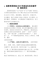 x县教育局党组2023年政治生态自查评价报告范文县教育局坚持“从严治党"与"从严治教”相结合,认真落实县委县政府《关于建立政治生态评价体系的意见(试行)》要求,高度重视,细查反思,多措并举,扎实整改,践行立德树人的初心和使命,努力建设一支清正廉洁、师德高尚、业务精湛的干部教师队伍,努力营造风清气正的教育生态。一、政治生态现状(一)明责任,扛起政治生态建设重任。健全教育系统政治生态建设工作机制,细化党风廉政建设主体责任清单,层层签订目标责任书,明确责任,推动政治生态建设主体责任向学校延伸。坚持“一把手”以身作则,当好“领头雁”,分管领导自觉落实“一岗双责”,从严干部教师监督考核,形成人人明责任、...