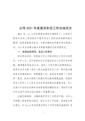 ·1公司2021年度意识形态工作总结范文2021年,xx公司在集团党委的正确领导下,认真学习贯彻中央和上级党委关于意识形态工作的决策部署和指示精神,坚持党管意识形态,不断加强和改进意识形态领域工作,为公司各项事业稳步发展提供强有力的思想保证。一、加强组织领导,压实工作责任落实责任体系。党委班子对公司意识形态工作负主体责任,今年x月,召开党委会对公司意识形态工作进行任务部署,强调要把好政治方向,坚定广大党员群众的理想信念。党委书记作为第一责任人带头抓意识形态工作,带头批评错误观点和错误倾向,部署重要工作。领导成员按照“一岗双责”要求,抓好分管部门的意识形态教育管理监督,将意识形态工作列入个人民主...
