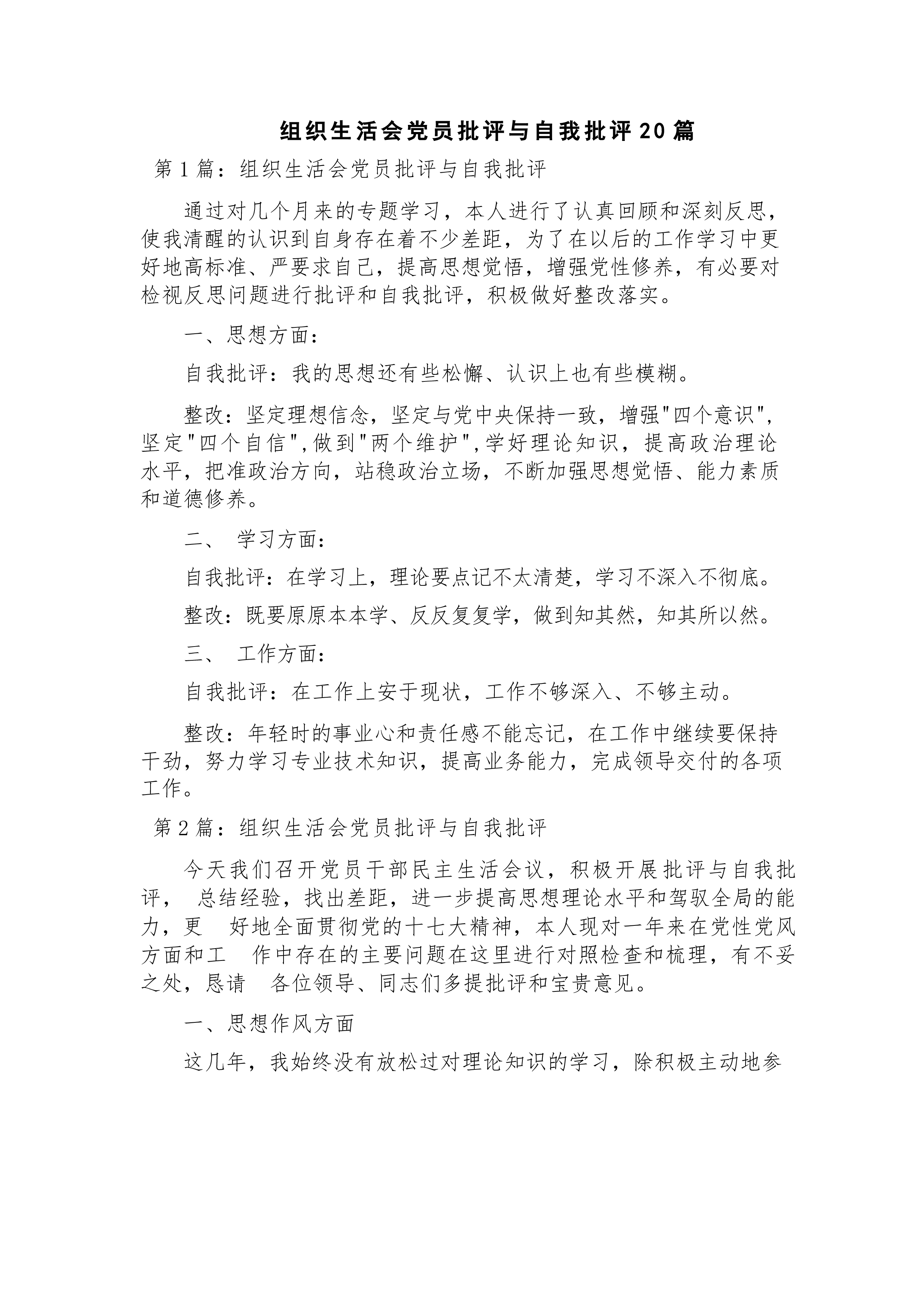 组织生活会党员批评与自我批评20篇第1篇:组织生活会党员批评与自我批评通过对几个月来的专题学习,本人进行了认真回顾和深刻反思,使我清醒的认识到自身存在着不少差距,为了在以后的工作学习中更好地高标准、严要求自己,提高思想觉悟,增强党性修养,有必要对检视反思问题进行批评和自我批评,积极做好整改落实。一、思想方面:自我批评:我的思想还有些松懈、认识上也有些模糊。整改:坚定理想信念,坚定与党中央保持一致,增强"四个意识",坚定"四个自信",做到"两个维护",学好理论知识,提高政治理论水平,把准政治方向,站稳政治立场,不断加强思想觉悟、能力素质和道德修养。二、学习方面:自我批评:在学习上,理论要点记不太...