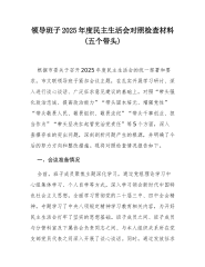 XX区文联党组2025年度民主生活会班子对照检查材料(五个带头)(精品)根据区委关于召开2025年度民主生活会的统一部署,XX区文联党组紧扣本次民主生活会主题,深入学习了习近平新时代中国特色社会主义思想、党的二十届三中、四中全会精神以及习近平总书记系列重要讲话和指示批示精神。党组班子在深化学习研讨、广泛征求意见、深入谈心谈话的基础上,认真对照“五个带头”要求,坚持把自己摆进去、把职责摆进去、把工作摆进去,深入查摆了存在的突出问题,深刻剖析了问题根源,明确了下一步的整改方向和措施。现将班子对照检查情况报告如下。一、存在的主要问题(一)在带头强化政治忠诚、提高政治能力方面一是理论学习与文艺实践工作的“最后一公里”尚未完全打通。党组班子虽然能够坚持“第一议题”制度,及时组织学习党的创新理论,但在将...