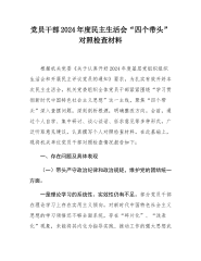 2024年度组织生活会、民主生活会对照检查材料(四个带头+以案促改)(1)按照《通知》要求,会前,本人坚持以重要指示精神为“行动指南”,系统学习党章、《条例》等党内法规,全面领悟深化改革的“深远意义”。通过与班子成员和广大干部深入开展“面对面”谈心谈话,广泛征求了各层次、各领域的意见建议,围绕“五个方面”逐一查摆问题,以“放大镜”剖析党性,以“显微镜”检视反思,深挖思想根源剖析问题成因,明确整改措施和努力方向。现将个人对照查摆情况报告如下。一、存在的突出问题(一)带头严守政治纪律和政治规矩,维护党的团结统一方面。一是“学思践悟”不够深入。在学习新思想等政治理论时,虽积极参与各类学习活动,但存在...
