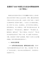 县委办公室机关党支部2025年度组织生活会班子对照检查材料(五个对照)根据县委关于召开2025年度基层党组织组织生活会的统一部署和要求,县委办公室机关党支部委员会在深入组织学习、广泛征求意见、普遍开展谈心谈话的基础上,紧紧围绕本次组织生活会主题,聚焦党员身份本色、岗位履职实效、作风建设细节,对照《中国共产党章程》规定的党员义务和权利,对照新时代合格党员标准,深入查摆了在贯彻党的创新理论、加强党性锤炼、联系服务群众、发挥先锋模范作用、改作风树新风等方面存在的突出问题,深刻剖析了问题产生的根源,并研究制定了下一步的整改措施。现将班子对照检查情况报告如下。一、上年度组织生活会检视问题整改落实情况在2024年度组织生活会上,支委会班子共查摆出理论学习深度不足、工作作风不够扎实、服务群众意识不够强、斗...