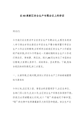 在XX高新区安全生产专题会议上的讲话同志们:今天我们在这里召开全区安全生产专题会议,主要任务是深入学习领会并传达落实全市安全生产警示教育暨冬季安全生产工作会议的精神,分析研判当前我区安全生产工作面临的严峻形势,并对今冬明春这一关键时期的安全生产工作进行再动员、再部署、再压实。刚才,XX同志传达了市里的会议精神,大家要认真学习、深刻领会、坚决贯彻。下面,我结合我区的实际情况,讲三点意见。一、认清形势,正视问题,深刻认识安全生产工作的极端重要性与紧迫性今年以来,在区党工委、管委会的坚强领导下,全区各单位、各部门同心协力,扎实工作,全区安全生产形势总体保持平稳。但我们必须清醒地认识到,这个“稳”的基础还不够牢固,“稳”的态势中依然潜藏着巨大的风险和挑战。安全生产这根弦,任何时候都不能松;安全生产的...