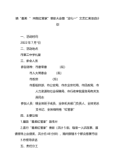 镇“最美‘’网格红管家”表彰大会暨“迎七一”文艺汇演活动计划一、活动时间2022年7月*日二、活动地点市第三中学礼堂三、参会人员参加领导:市委常委(拟)市人大常委会(拟)市政府(拟)市委组织部、市公安局、市农业农村局、市民政局、市人力资源和社会保障局、市行政审批服务局有关负责同志参加人员:镇全体班子成员、全体机关部门负责人、全体党总支书记、全体微网格“红管家”四、主要议程1.播放“最美红管家”宣传片2.进行“最美红管家”表彰(共计5组,每组一人讲故事,邀请领导上台颁奖,共计约40分钟),期间穿插8个群众歌舞节目3.市领导讲话五、责任分工1、政研室:负责活动材料讲话、新闻宣传等工作。2、政府办:...