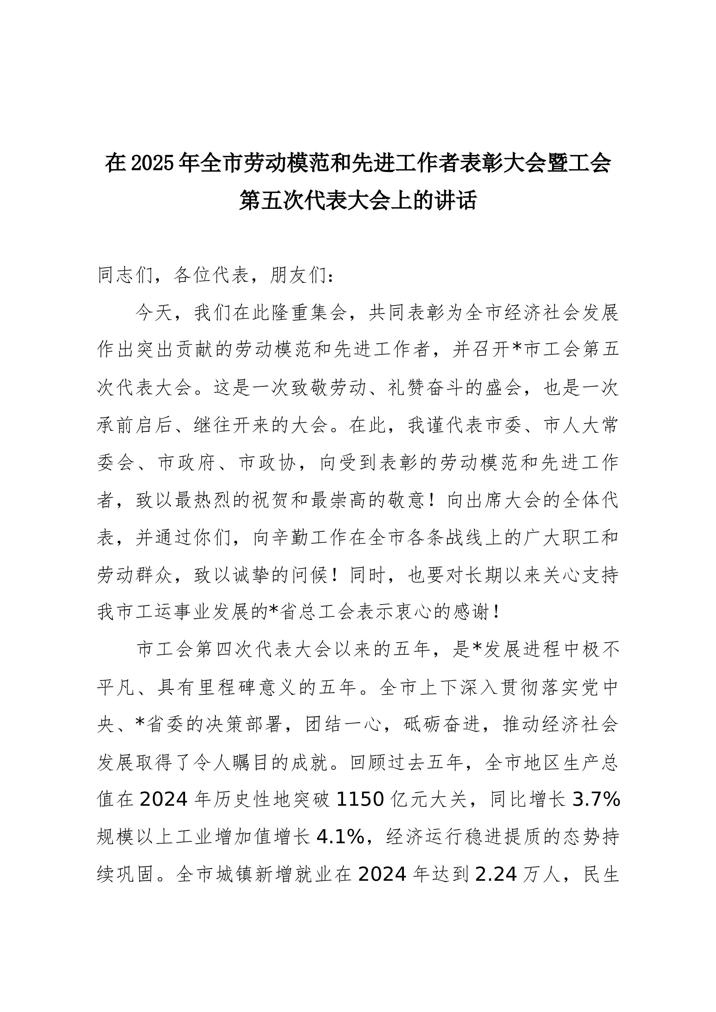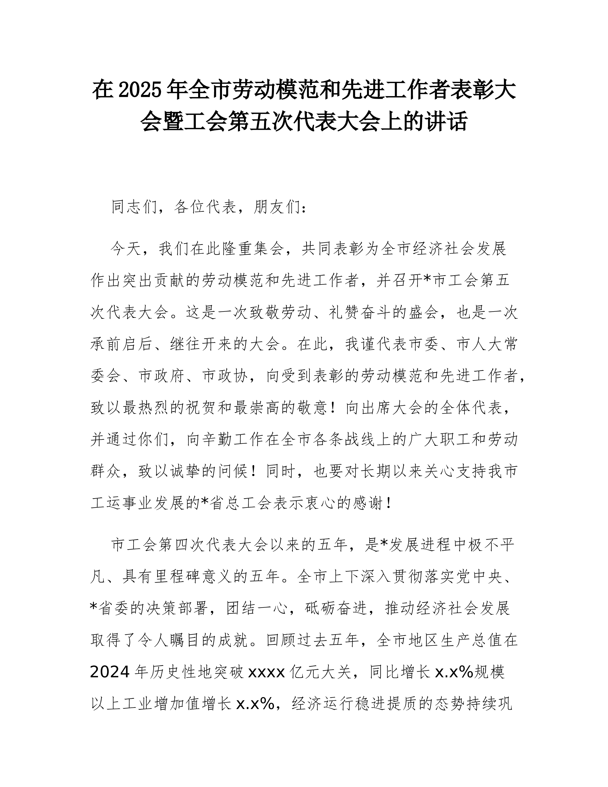 在2025年全市劳动模范和先进工作者表彰大会暨工会第五次代表大会上的讲话同志们,各位代表,朋友们: 今天,我们在此隆重集会,共同表彰为全市经济社会发展作出突出贡献的劳动模范和先进工作者,并召开*市工会第五次代表大会。这是一次致敬劳动、礼赞奋斗的盛会,也是一次承前启后、继往开来的大会。在此,我谨代表市委、市人大常委会、市政府、市政协,向受到表彰的劳动模范和先进工作者,致以最热烈的祝贺和最崇高的敬意!向出席大会的全体代表,并通过你们,向辛勤工作在全市各条战线上的广大职工和劳动群众,致以诚挚的问候!同时,也要对长期以来关心支持我市工运事业发展的*省总工会表示衷心的感谢! 市工会第四次代表大会以来的五年,是*发展进程中极不平凡、具有里程碑意义的五年。全市上下深入贯彻落实党中央、*省委的决策部署,...