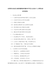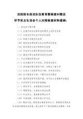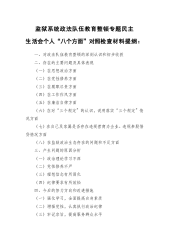 监狱系统政法队伍教育整顿专题民主生活会个人“八个方面”对照检查材料提纲:一、对政法队伍教育整顿的深刻认识和初步收获二、存在的主要问题及具体表现(一)在思想政治方面(二)在党性修养方面(三)在履职尽责方面(四)在工作作风方面(五)在廉洁自律方面(六)在对“三个规定”的认识,说明落实“三个规定”情况方面(七)在自己及家属是否存在违规营商办企业、违规参股借贷情况方面(八)在监狱政治生态存在的问题和不足方面三、产生问题的原因分析(一)政治理论学习不深(二)党性修养不严(三)理想信念有所弱化(四)纪律要求有所放松四、今后的努力方向和改进措施(一)强化学习,全面提高自身素质(二)增强党性,认真执行政治纪律...