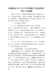 20232023年上半年,区财政局紧紧围绕区委、区政府中心工作,全力以赴争要素、保平衡、强保障,为纵深推进产业聚变、某市蝶变、幸福跃变提供最大财力支撑。现将上半年工作总结和下半年工作思路汇报如下:一、上半年财政工作情况X-X月,全区财政总收入实现X万元,同比增长X.X%,完成年度任务的X.X%。一般公共预算收入X万元,同比增长X.X%,完成年度任务的X.X%。其中:税收收入X万元,同比增长X%,完成年度任务的X.X%,非税收入X万元,同比下降X.X%,完成年度任务的X.X%。税收收入占一般公共预算收入比重X.X%,比上年同期提高X.X个百分点。X-X月,全区一般公共预算支出X万元,同比增长X....