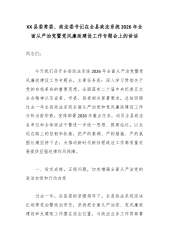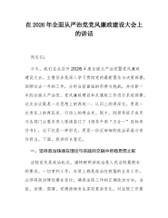 XX县委常委、政法委书记在全县政法系统2026年全面从严治党暨党风廉政建设工作专题会上的讲话同志们: 今天我们召开全县政法系统2026年全面从严治党暨党风廉政建设工作专题会,主要任务是:深入学习贯彻关于党的自我革命的重要思想,全面落实二十届中央纪委五次全会精神以及省委、市委、县委相关部署要求,总结回顾过去一年全县政法系统全面从严治党和党风廉政建设工作分析当前形势,安排部署2026年重点任务,动员全县政法各单位和全体政法干警进一步统一思想、提高站位,以永远在路上的坚韧和执着,把严的基调、严的措施、严的氛围长期坚持下去,为推动新时代新征程政法工作高质量发展提供坚强纪律作风保障。 一、肯定成绩,正视问题,切实增强全面从严治党的政治自觉和行动自觉 过去一年,在县委的坚强领导下,全县政法系统坚决...