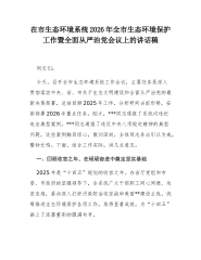 在市生态环境系统2026年全市生态环境保护工作暨全面从严治党会议上的讲话稿同志们:今天,召开全市生态环境系统工作会议,主要任务是深入贯彻落实中央、省、市关于生态文明建设和全面从严治党的最新决策部署,总结回顾2025年工作,分析研判当前形势,安排部署2026年重点任务。刚才,***同志通报了系统内违纪违法典型案例,***同志通报了违反中央八项规定精神的典型问题,这些案例触目惊心,教训深刻,全体同志务必引以为戒,警钟长鸣。下面,结合工作实际,讲几点意见。一、回顾收官之年,在砥砺奋进中奠定坚实基础2025年是“十四五”规划的收官之年。在省厅党组和市委、市政府的坚强领导下,全系统广大干部职工同心同德、攻坚克难,紧扣深入打好污染防治攻坚战和美丽**建设主线,统筹推进生态环境保护各项工作,取得显著成效,...