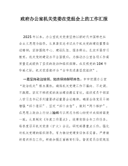 政府办公室机关党委在党组会上的工作汇报2025年以来,办公室机关党委坚持以习近平新时代中国特色社会主义思想为指导,认真落实习近平总书记关于机关党的建设重要论述精神,坚持围绕中心、建设队伍、服务群众,扎实开展学习教育,机关党的建设水平全面提升,为推动办公室各项工作高质量完成提供了坚实的政治和组织保障。在庆祝党的104年华诞之际,机关党委被评为“全市先进基层党组织”。一是坚持政治统领,始终保持鲜明本色。牢牢把握办公室“政治机关”根本属性,确保机关党建工作不偏向、不走调、不跑题。坚定不移把党的政治建设摆在首位,组织党员干部深入学习习近平总书记系列重要讲话重要会议精神,确保全体党员干部增强“四个意识”、坚定“四个自信”,做到“两个维护”,在思想上政治上行动上始终与以习近平同志为核心的党中央保持高度一...