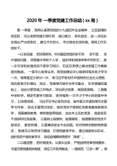 2020年一季度党建工作总结(xx局)第一季度,我局认真贯彻党的十九届四中全会精神,立足疫情防控实际,充分发挥党建引领作用,凝心聚力,争先创优,进一步压实全面从严治党责任,建立不忘初心、牢记使命长效机制。现将工作总结如下。一以学促建,把好思想关。针对基层党组织学不深、学不透、学不够的问题,采取集中学和个人学、组织学和网络学等不同形式,进一步引导和加强党员干部学习培训,切实在思想上解决党建工作难推进的瓶颈。一是中心组带头学。局党组理论中心组坚持每月至少学习一次、每季度至少研讨一次,将习近平新时代中国特色社会主义思想、党的政策方针理论、宪法、党章等内容作为学习重点,在学原著的基础上,结合分管领域工...