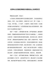 在2024年国资国企党建和全面从严治党工作会议暨党建品牌交流会上的讲话同志们:中国特色现代国有企业制度,“特”就特在把党的领导融入公司治理各环节,把企业党组织内嵌到公司治理结构之中。在公司治理结构中体现党的领导,就要推动国有企业党委在完善公司治理中发挥好领导作用。下面,我讲几点体会,以供大家参考。一、统一思想,充分认识国有企业党委在完善公司治理中发挥领导作用的重大意义(一)党组织在国有企业公司治理结构中具有法定地位。国有企业党委是党的组织体系重要组成部分,从宪法、公司法到中国共产党章程、党的重要会议决定及规章要求以及中央政策指引和习近平总书记重要指示精神,对党组织在公司治理结构中的法定地位都有...