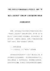 中建八局东北公司基础设施分公司党总支:铸牢“军魂匠心·沈铁亮剑”党建品牌以高质量党建引领轨道交通建设新标杆 提要:沈阳地铁6号线首府新区车辆段项目党支部以“军魂匠心·沈铁亮剑”党建品牌为统领,将中建八局“铁军文化”与新时代党建工作深度融合。面对地质复杂、管线迁改难、工期紧张三重挑战,品牌以“党旗+地铁车辆+利剑”为标识,构建“四维驱动”实践体系。 一、品牌创建背景 (一)项目攻坚:三大“硬骨头”亟待破解 沈阳地铁6号线是沈阳市“十四五”重点民生工程,首府车辆段作为全线规模最大、技术最复杂的控制性节点,面临三重挑战:1、地质风险突出:场地属富水岩溶地层,溶洞发育率达35%,桩基施工沉降控制精度要求±2mm;2、管线迁改梗阻:地下纵横分布电力、燃气等7类管线,涉及产权单位11家,协调难度...