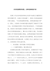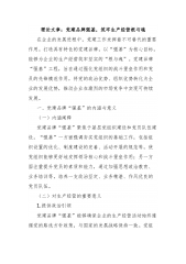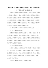 理论文章:以党建品牌激活文化动能:国企“红色引擎”与“文化名片”的协同打造国有企业是国民经济的重要支柱,在国家经济社会发展中承担着重要责任。党建工作是国有企业独特的政治优势,而企业文化是企业核心竞争力的重要组成部分。随着市场竞争的加剧和企业发展的需要,将党建品牌与企业文化协同打造,以党建品牌激活文化动能,成为国有企业提升综合实力、实现可持续发展的重要途径。一、党建品牌与企业文化的内涵及相互关系(一)党建品牌的内涵党建品牌是指以党的建设为核心,以服务企业发展、服务员工群众为目标,通过整合党建资源、创新党建工作方式方法,形成具有独特性、创新性和影响力的党建工作载体和模式。党建品牌具有鲜明的政治导向和时代特征,体现了党的先进性和纯洁性。(二)企业文化的内涵企业文化是企业在长期的生产经营过程中形成的...