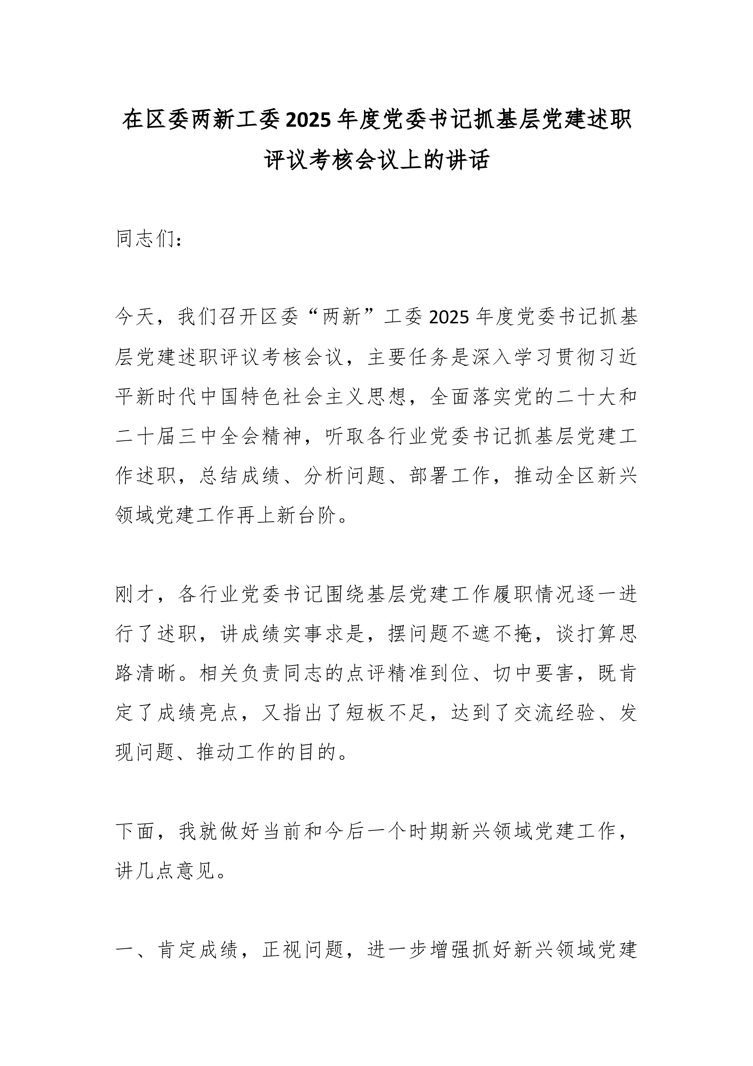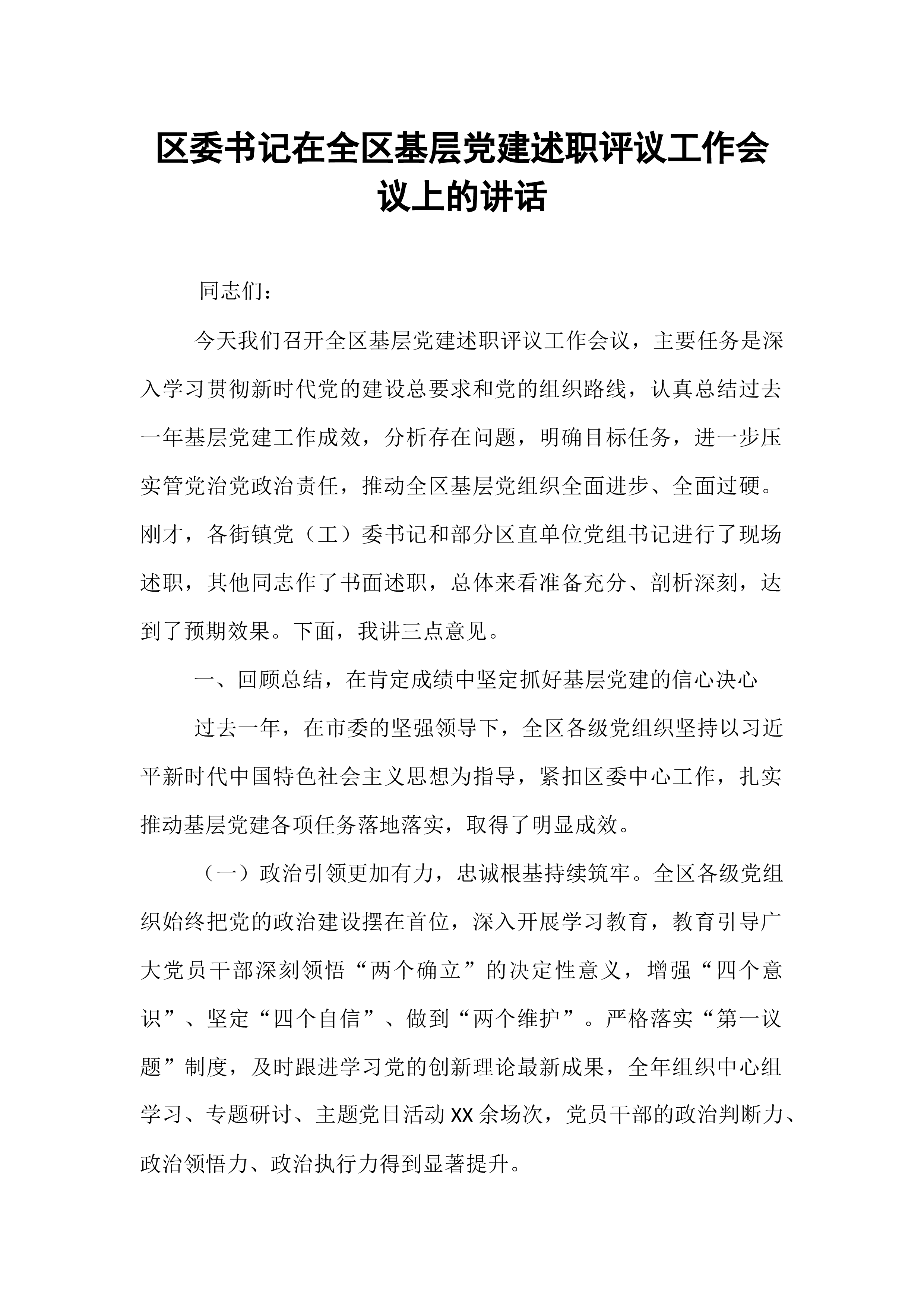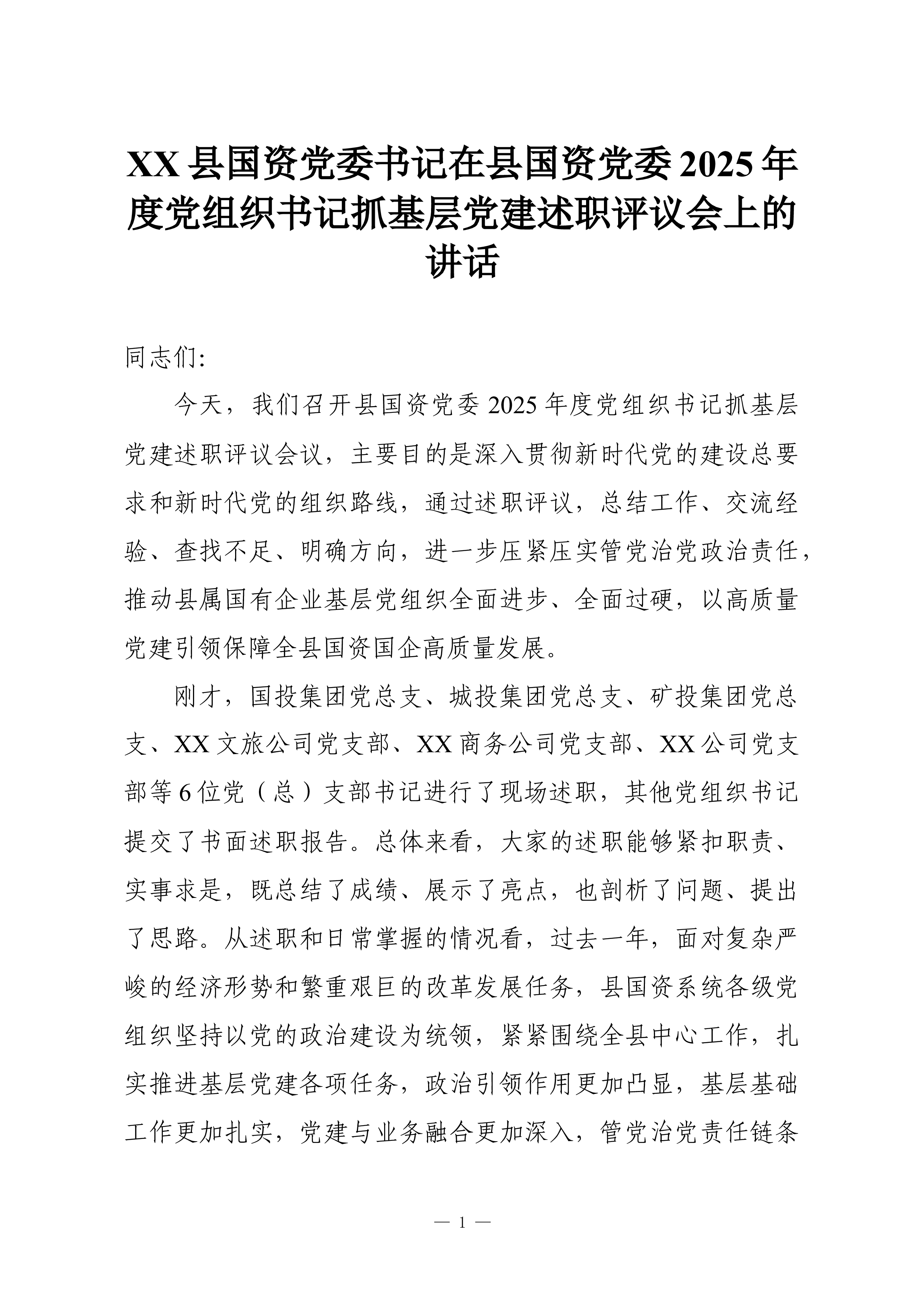 XX县国资党委书记在县国资党委2025年度党组织书记抓基层党建述职评议会上的讲话同志们:今天,我们召开县国资党委2025年度党组织书记抓基层党建述职评议会议,主要目的是深入贯彻新时代党的建设总要求和新时代党的组织路线,通过述职评议,总结工作、交流经验、查找不足、明确方向,进一步压紧压实管党治党政治责任,推动县属国有企业基层党组织全面进步、全面过硬,以高质量党建引领保障全县国资国企高质量发展。刚才,国投集团党总支、城投集团党总支、矿投集团党总支、XX文旅公司党支部、XX商务公司党支部、XX公司党支部等6位党(总)支部书记进行了现场述职,其他党组织书记提交了书面述职报告。总体来看,大家的述职能够紧扣职责、实事求是,既总结了成绩、展示了亮点,也剖析了问题、提出了思路。从述职和日常掌握的情况看,过去...
