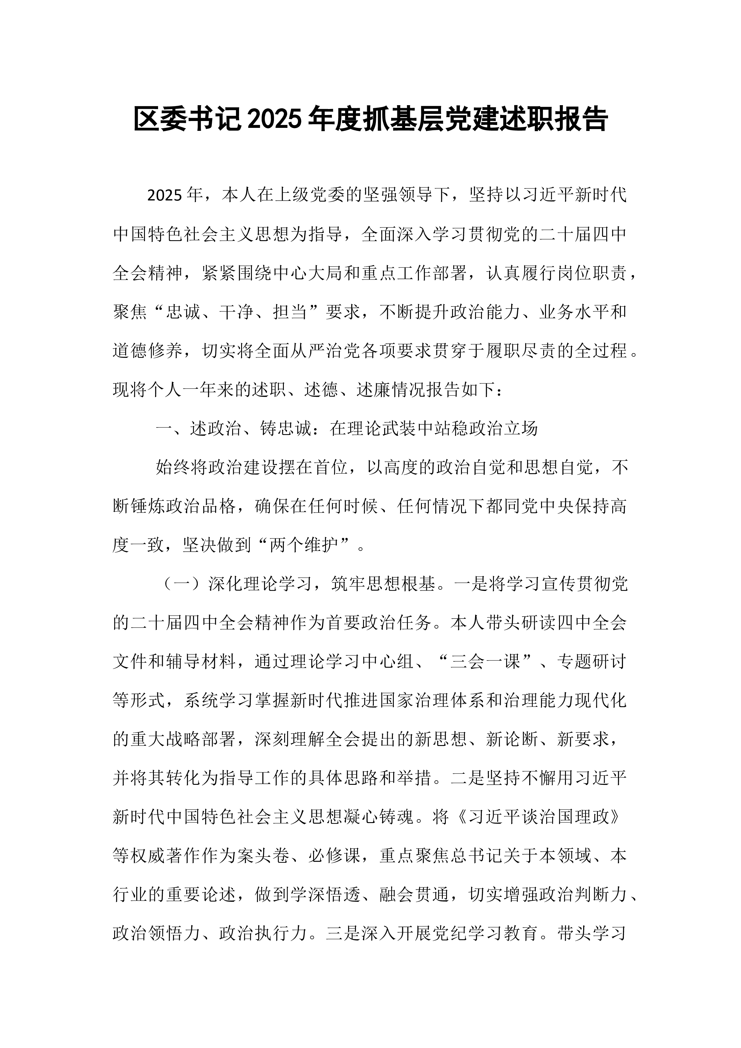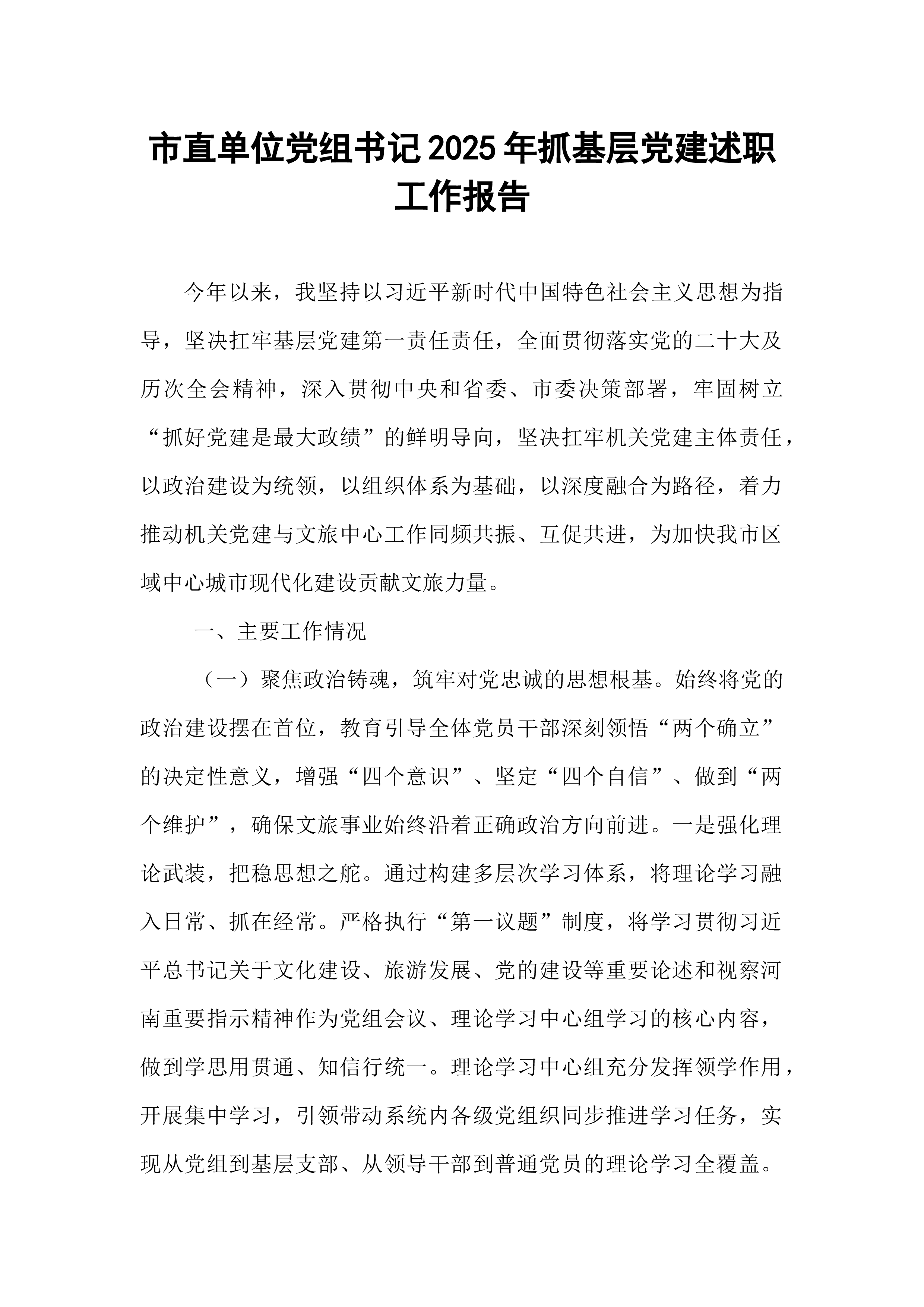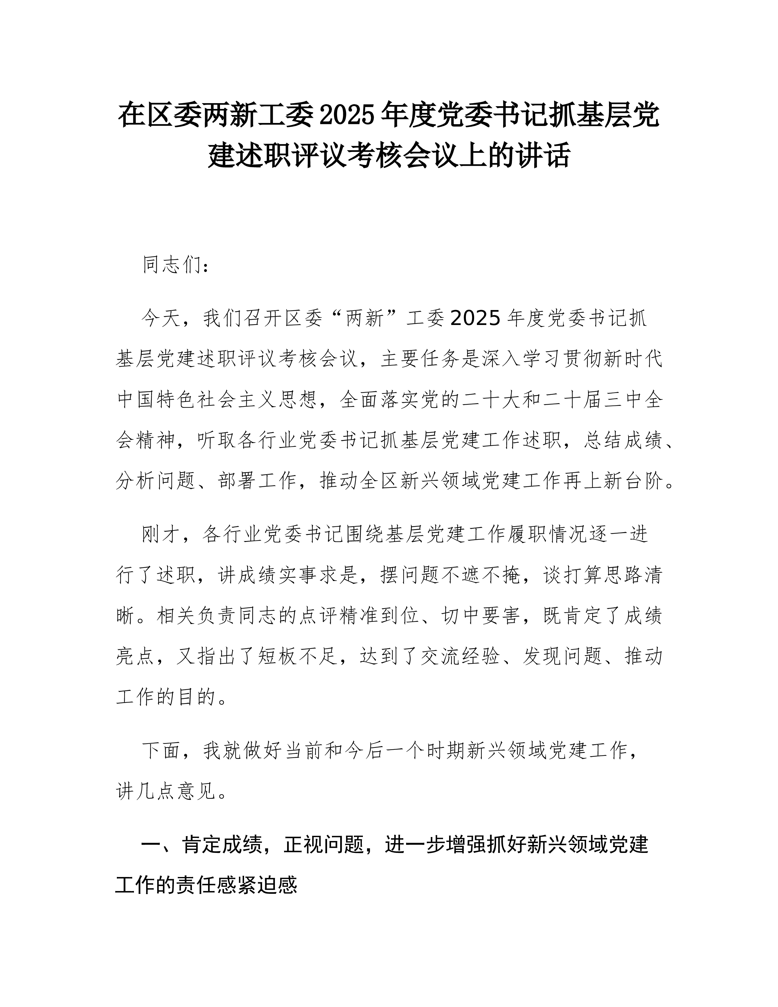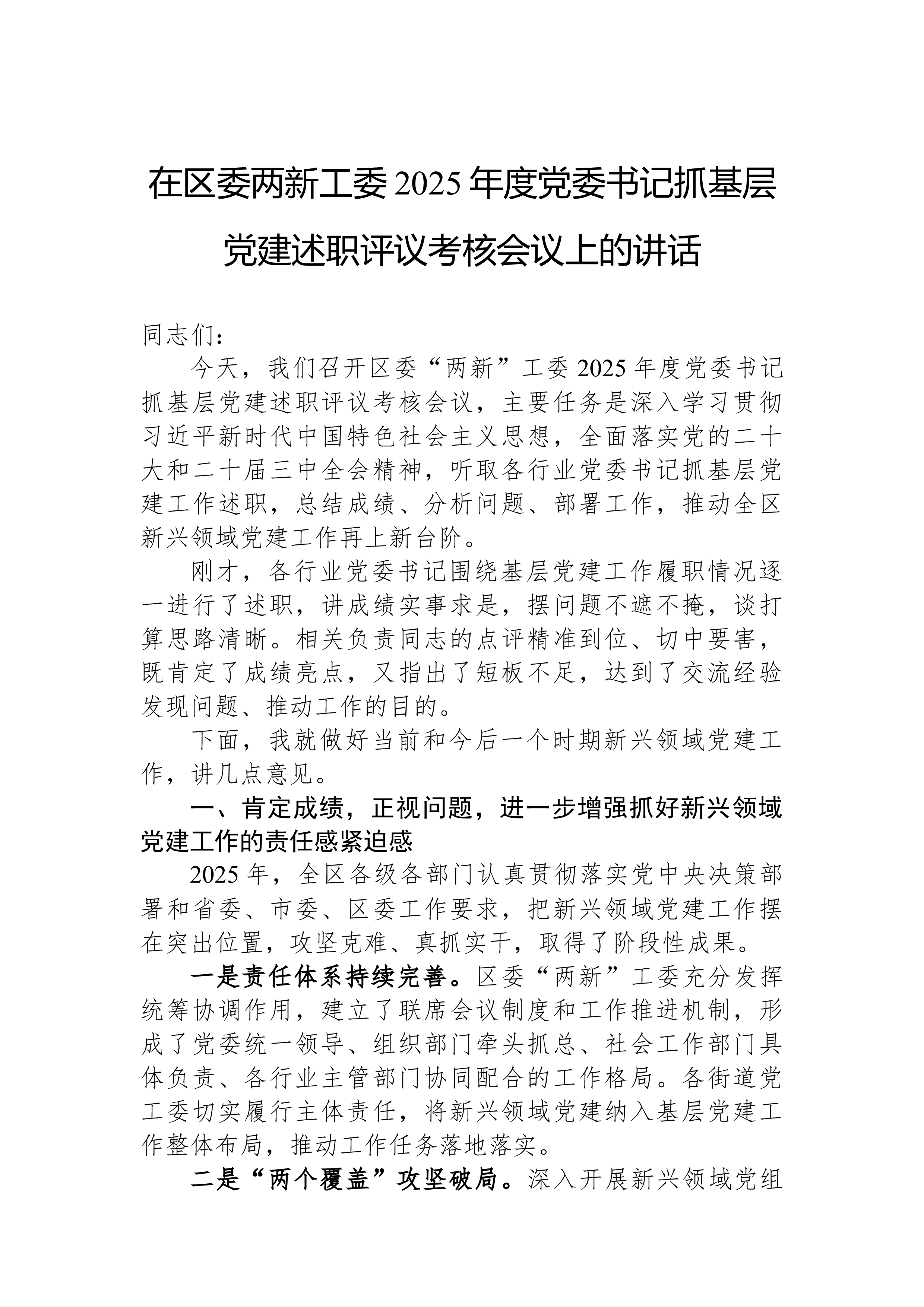 XX县国资党委书记在县国资党委2025年度党组织书记抓基层党建述职评议会上的讲话同志们:今天,我们召开县国资党委2025年度党组织书记抓基层党建述职评议会议,主要目的是深入贯彻新时代党的建设总要求和新时代党的组织路线,通过述职评议,总结工作、交流经验、查找不足、明确方向,进一步压紧压实管党治党政治责任,推动县属国有企业基层党组织全面进步、全面过硬,以高质量党建引领保障全县国资国企高质量发展。刚才,国投集团党总支、城投集团党总支、矿投集团党总支、XX文旅公司党支部、XX商务公司党支部、XX公司党支部等6位党(总)支部书记进行了现场述职,其他党组织书记提交了书面述职报告。总体来看,大家的述职能够紧扣职责、实事求是,既总结了成绩、展示了亮点,也剖析了问题、提出了思路。从述职和日常掌握的情况看,过去...