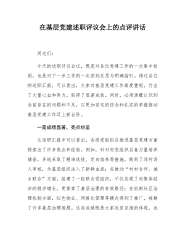 国企党委书记在党组织书记抓基层党建述职评议会议上的点评讲话同志们:根据公司党委的安排部署,今天我们召开基层党组织书记抓基层党建述职评议会议,目的是深入学习贯彻新时代中国特色社会主义思想和党的二十大精神,进一步强化基层党组织书记抓党建工作的责任意识,提升党建工作质量,推动全面从严治党向基层延伸。刚才,各基层党组织书记就2024年抓党建工作情况进行了述职,既总结了成绩,又查找了问题,还提出了下一步工作思路和措施。总的来说,大家的述职客观实在,总结成绩实事求是,分析问题深刻透彻,工作打算切实可行,达到了预期效果。下面,我结合平时掌握的情况和今天的述职,讲几点意见。一、2024年基层党建工作成效显著(...