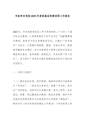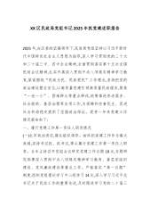 XX区民政局党组书记2025年抓党建述职报告2025年,在区委的坚强领导下,民政局党组坚持以习近平新时代中国特色社会主义思想为指导,深入学习贯彻党的二十大和二十届三中、四中全会精神,全面贯彻落实第十五次全国民政会议精神,扎实开展深入贯彻中央八项规定精神学习教育,紧紧围绕“民政为民、民政爱民”工作理念,坚持把党的政治建设摆在首位,以高质量党建引领高质量民政服务,聚焦“一老一小”、困难群众等重点群体,统筹推进养老服务、社会救助、基层治理等各项工作,为保障和改善民生、促进社会和谐稳定提供了坚强政治保证。现将一年来党建工作情况报告如下:一、履行党建工作第一责任人职责情况(一)扛牢政治责任,强化组织领导。始终把党建工作作为最大政绩,坚持书记抓、抓书记,带头履行党建工作第一责任人职责。全年主持召开党组会...