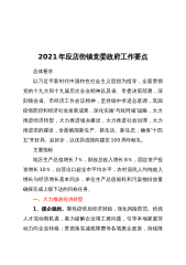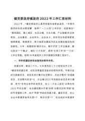 2020年,镇党委政府围绕疫情防控和“三大攻坚战”,坚持从人民群众的需求和愿望出发,重点突破,较好的完成了县委、县政府下达我镇2020年各项工作目标任务。镇党委政府严格按照中央、省、市、县委安排部署,充分发挥各村动员能力,统筹全镇做好疫情防控工作。成立了应对新冠肺炎疫情防控指挥部,明确责任,细化分工,实施镇村干部多级网格管控管理,将全镇X个村和X个居委会分为X个网格,合理布控X个防控卡点,X余名志愿者配合村卡点严控人员出入,形成联防联控、群防群治局面;按照市县应对新冠肺炎疫情防控公告,对重点人员全方位排查并实施居家隔离、集中隔离,落实包保责任,做好各个企业的复工复产准备工作。2020年,我镇未...