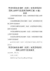 学员代表在全省村(社区)女党员培训示范班上的学习交流发言材料汇编(6篇)1.学员代表在全省村(社区)女党员培训示范班上的学习交流发言...........................................................................................22.社区居委会副主任在全省村(社区)女党员培训示范班上的学习交流发言.........................................................................53.村党总支委员在全省村(社区)女党员培训示范班上的学习交流发言.....