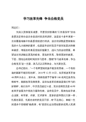学习改革先锋争当合格党员同志们:为深入贯彻落实省委、市委安排部署的“工作落实年”活动县委决定举办这次全县农村党员培训班,这是近十多年来第一次全覆盖地集中到县委党校进行培训。这次培训既是贯彻落实党的十九大精神的要求,也是提升农村党员干部宗旨意识和整体素质,增强农村基层党组织凝聚力、战斗力的迫切需要。希望这次培训能以更高的标准、更实的学风,取得更好的效果。下面,我结合前段时间的学习思考,围绕“学习改革先锋,争当合格党员”这一主题,谈几点认识和体会,与大家交流。总书记指出,“一个有希望的民族不能没有英雄,一个有前途的国家不能没有先锋”。2018年12月18日,在庆祝改革开放40周年大会上,党中央、国...