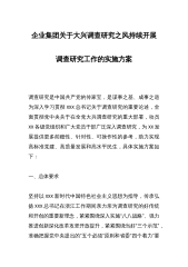 企业集团关于大兴调查研究之风持续开展调查研究工作的实施方案调查研究是中国共产党的传家宝,是谋事之基、成事之道为深入学习贯彻习近平总书记关于调查研究的重要论述,全面贯彻党中央关于在全党大兴调查研究的重大部署,动员XX各级党组织和广大党员干部广泛深入调查研究,为XX发展提供更多前瞻性、针对性、可操作性的参考,助力实现高标准党建、高质量发展和高水平民生,具体实施方案如下:一、总体要求坚持以XXX新时代中国特色社会主义思想为指导,传承弘扬习近平总书记在浙江工作期间亲力亲为调查研究的好传统和开创的重要新理念,紧紧围绕深入实施“八八战略”、强力推进创新深化改革攻坚开放提升,紧紧围绕当好“三个示范”,准确把...