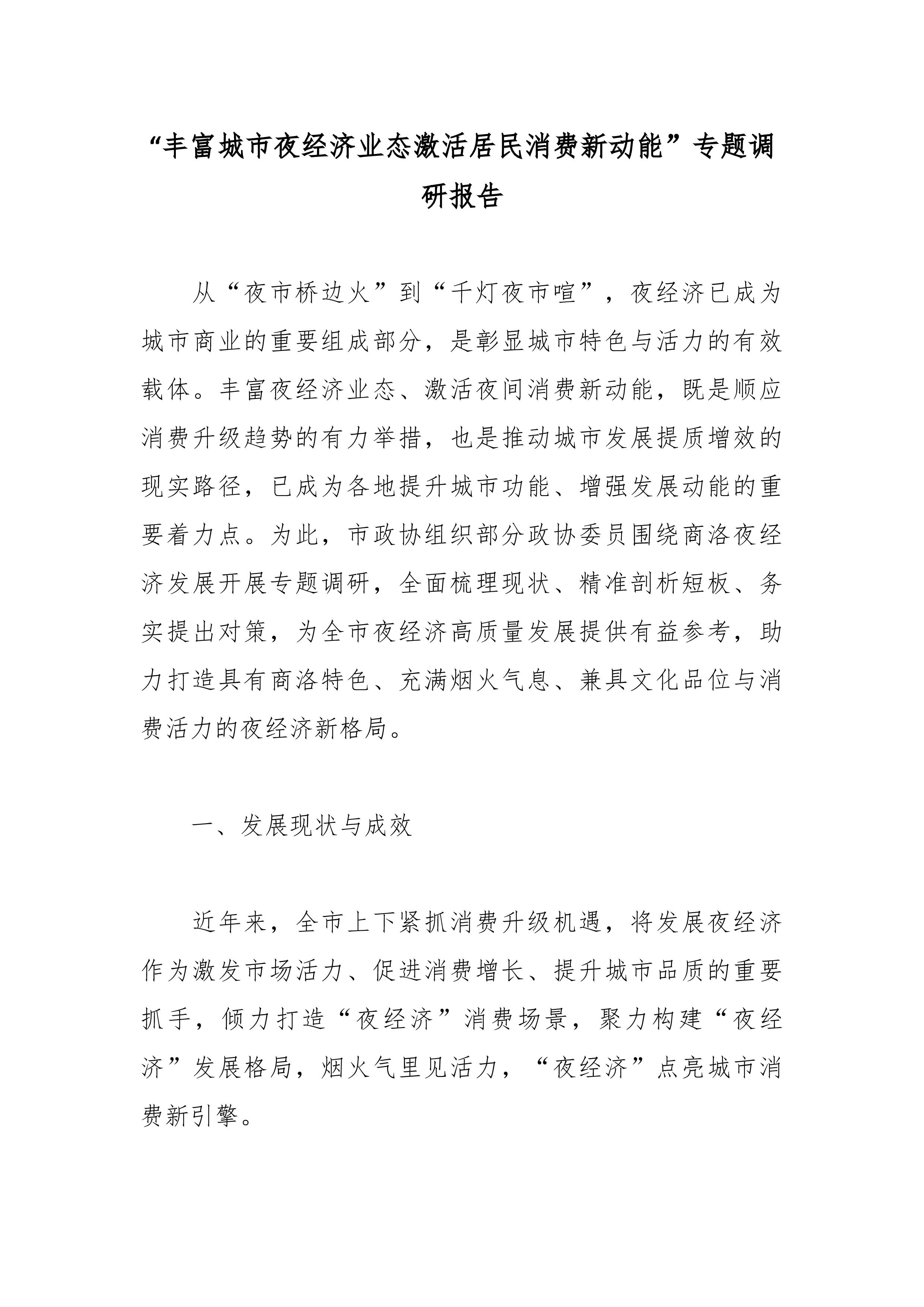 “丰富城市夜经济业态激活居民消费新动能”专题调研报告 从“夜市桥边火”到“千灯夜市喧”,夜经济已成为城市商业的重要组成部分,是彰显城市特色与活力的有效载体。丰富夜经济业态、激活夜间消费新动能,既是顺应消费升级趋势的有力举措,也是推动城市发展提质增效的现实路径,已成为各地提升城市功能、增强发展动能的重要着力点。为此,市政协组织部分政协委员围绕商洛夜经济发展开展专题调研,全面梳理现状、精准剖析短板、务实提出对策,为全市夜经济高质量发展提供有益参考,助力打造具有商洛特色、充满烟火气息、兼具文化品位与消费活力的夜经济新格局。 一、发展现状与成效 近年来,全市上下紧抓消费升级机遇,将发展夜经济作为激发市场活力、促进消费增长、提升城市品质的重要抓手,倾力打造“夜经济”消费场景,聚力构建“夜经济”发...