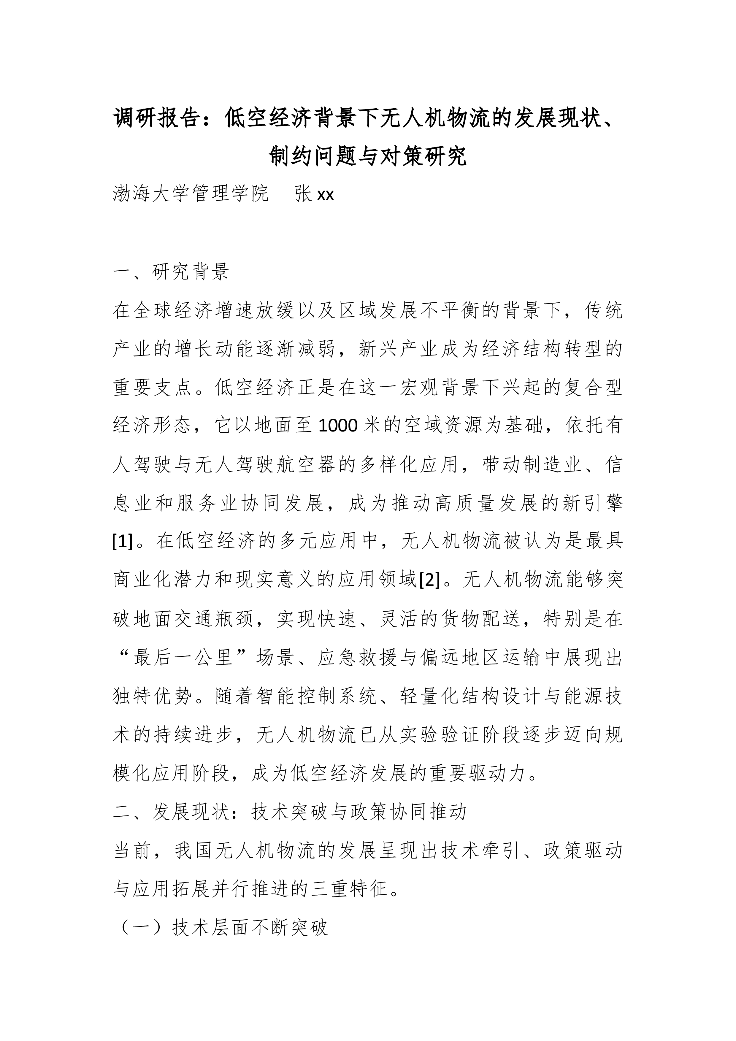 调研报告:低空经济背景下无人机物流的发展现状、制约问题与对策研究渤海大学管理学院张xx一、研究背景在全球经济增速放缓以及区域发展不平衡的背景下,传统产业的增长动能逐渐减弱,新兴产业成为经济结构转型的重要支点。低空经济正是在这一宏观背景下兴起的复合型经济形态,它以地面至1000米的空域资源为基础,依托有人驾驶与无人驾驶航空器的多样化应用,带动制造业、信息业和服务业协同发展,成为推动高质量发展的新引擎[1]。在低空经济的多元应用中,无人机物流被认为是最具商业化潜力和现实意义的应用领域[2]。无人机物流能够突破地面交通瓶颈,实现快速、灵活的货物配送,特别是在“最后一公里”场景、应急救援与偏远地区运输中展现出独特优势。随着智能控制系统、轻量化结构设计与能源技术的持续进步,无人机物流已从实验验证阶段逐...