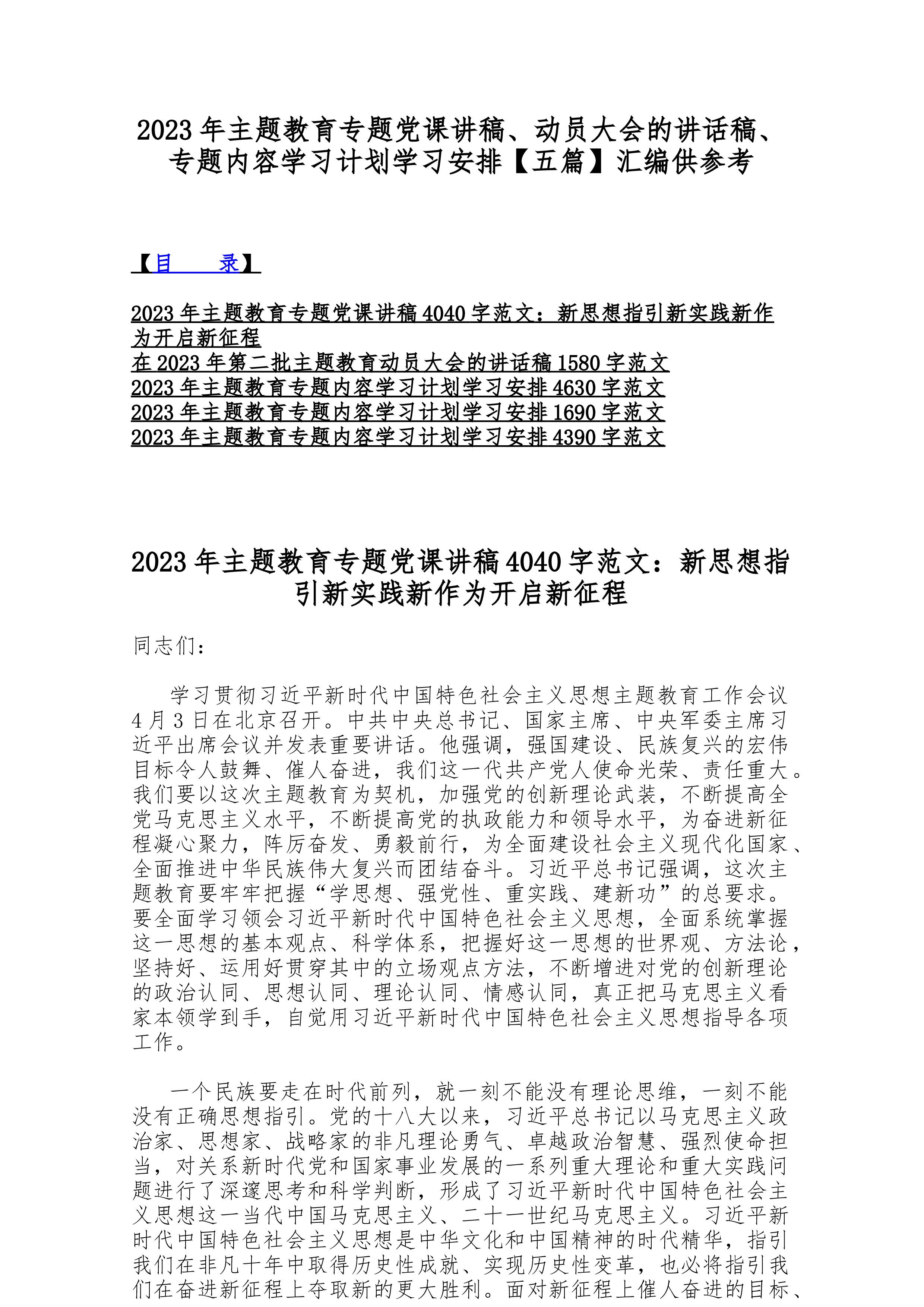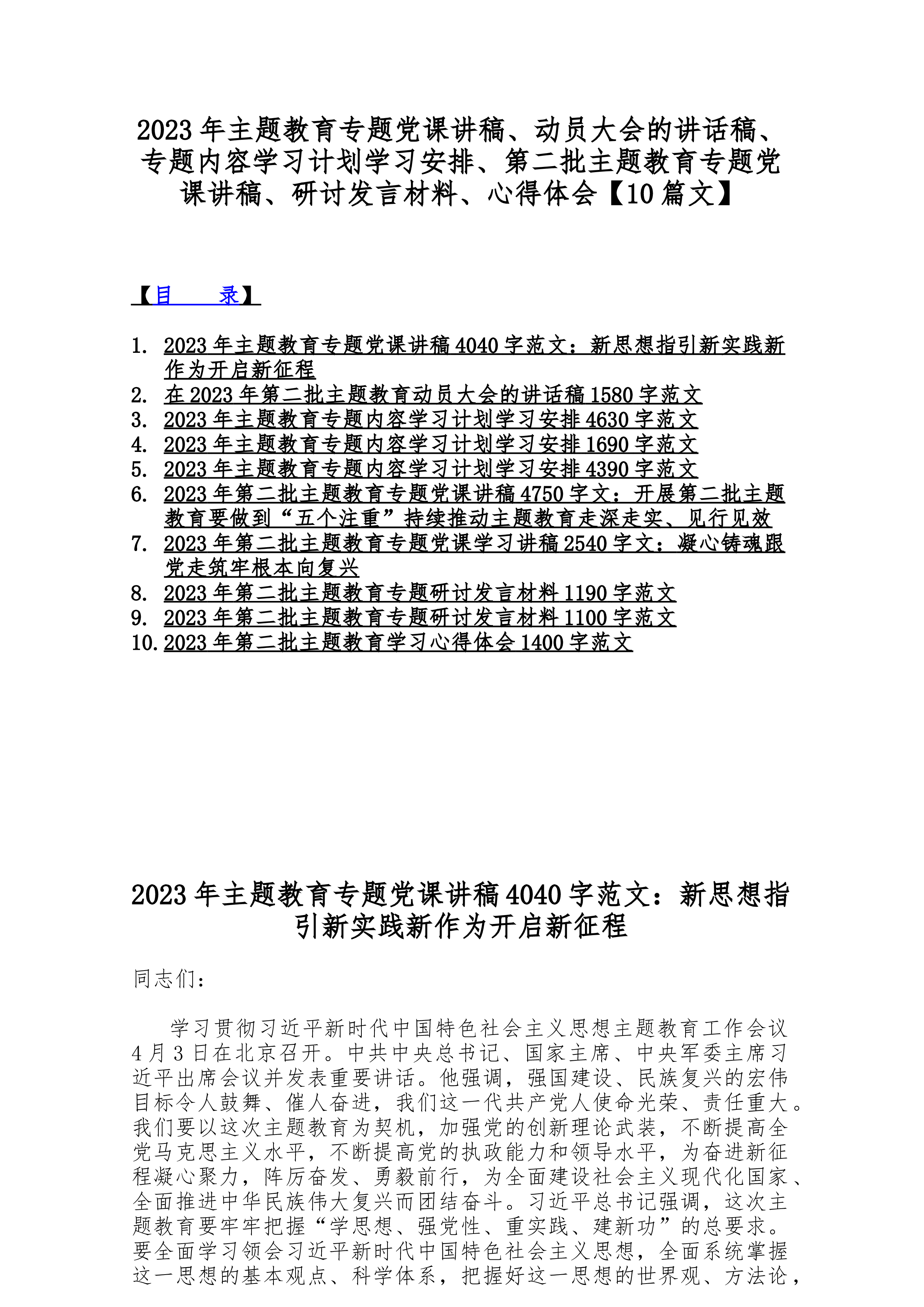 2023年主题教育专题党课讲稿、动员大会的讲话稿、专题内容学习计划学习安排、第二批主题教育专题研讨发言材料、学习心得、实施方案【多篇】供参考【目录】2023年主题教育专题党课讲稿4040字范文:新思想指引新实践新作为开启新征程在2023年第二批主题教育动员大会的讲话稿1580字范文2023年主题教育专题内容学习计划学习安排4630字范文2023年主题教育专题内容学习计划学习安排1690字范文2023年主题教育专题内容学习计划学习安排4390字范文2023年第二批主题教育专题研讨发言材料1240字范文2023年推动第二批主题教育学习心得体会感想1240字范文2023年法院党员干部...