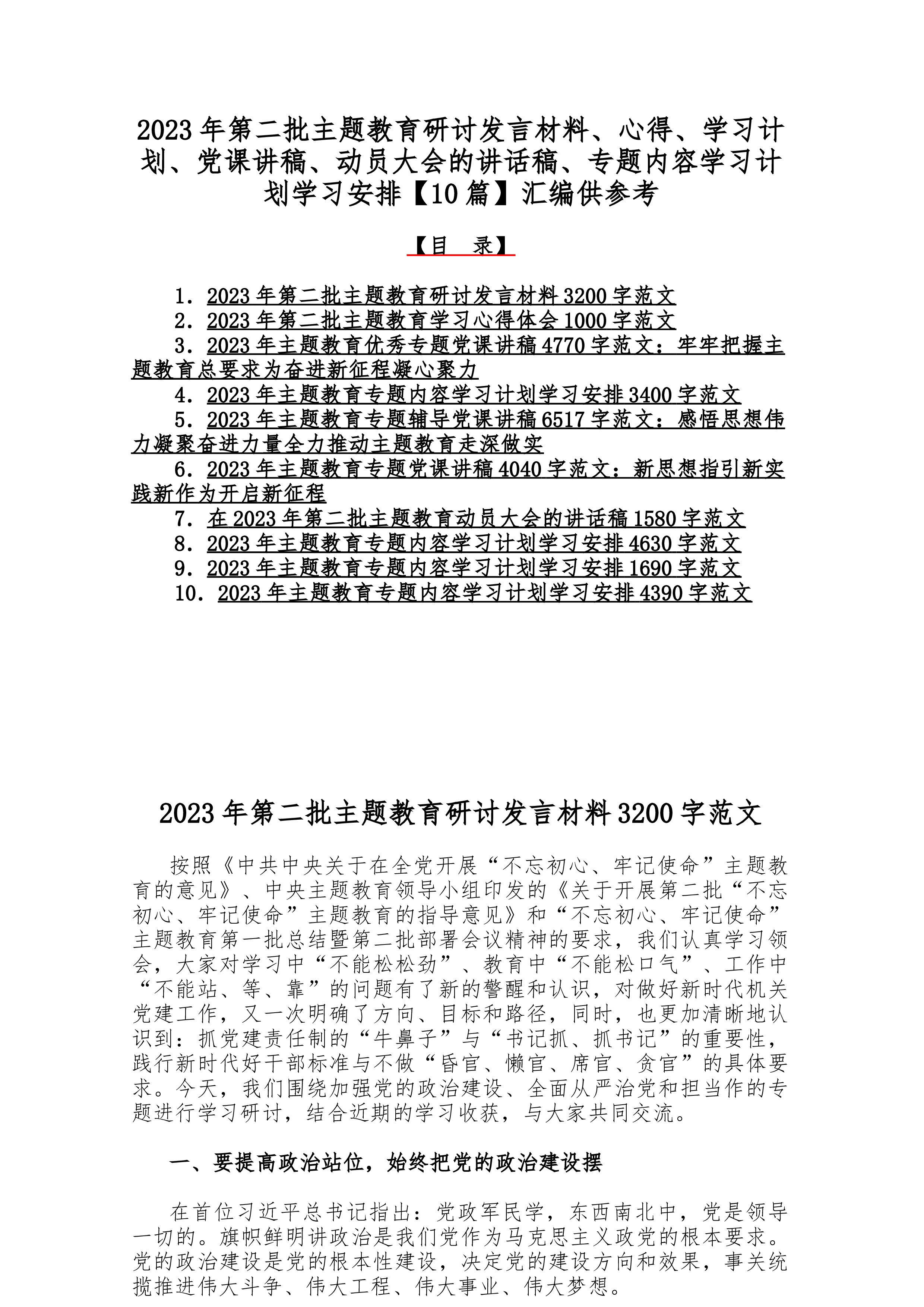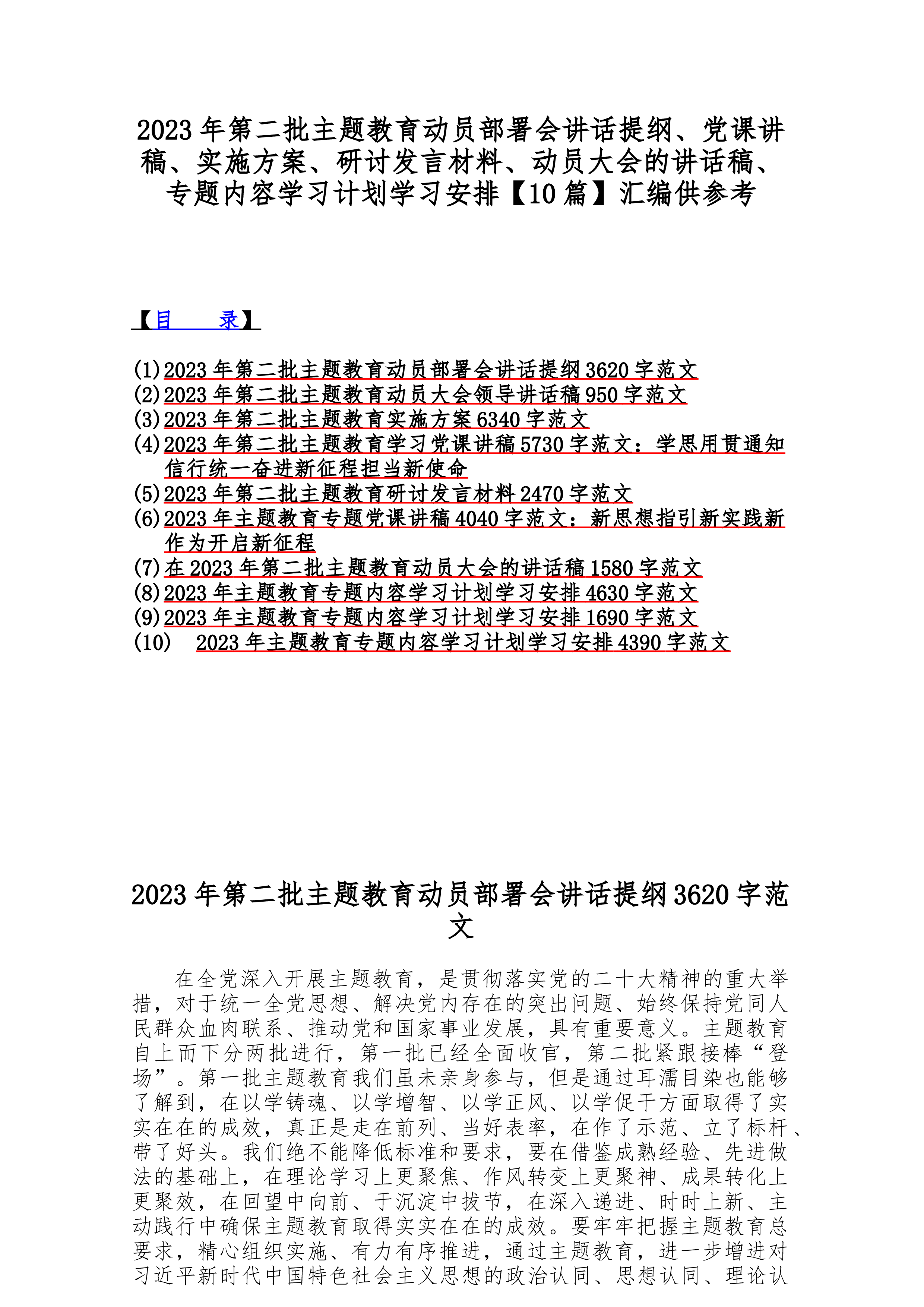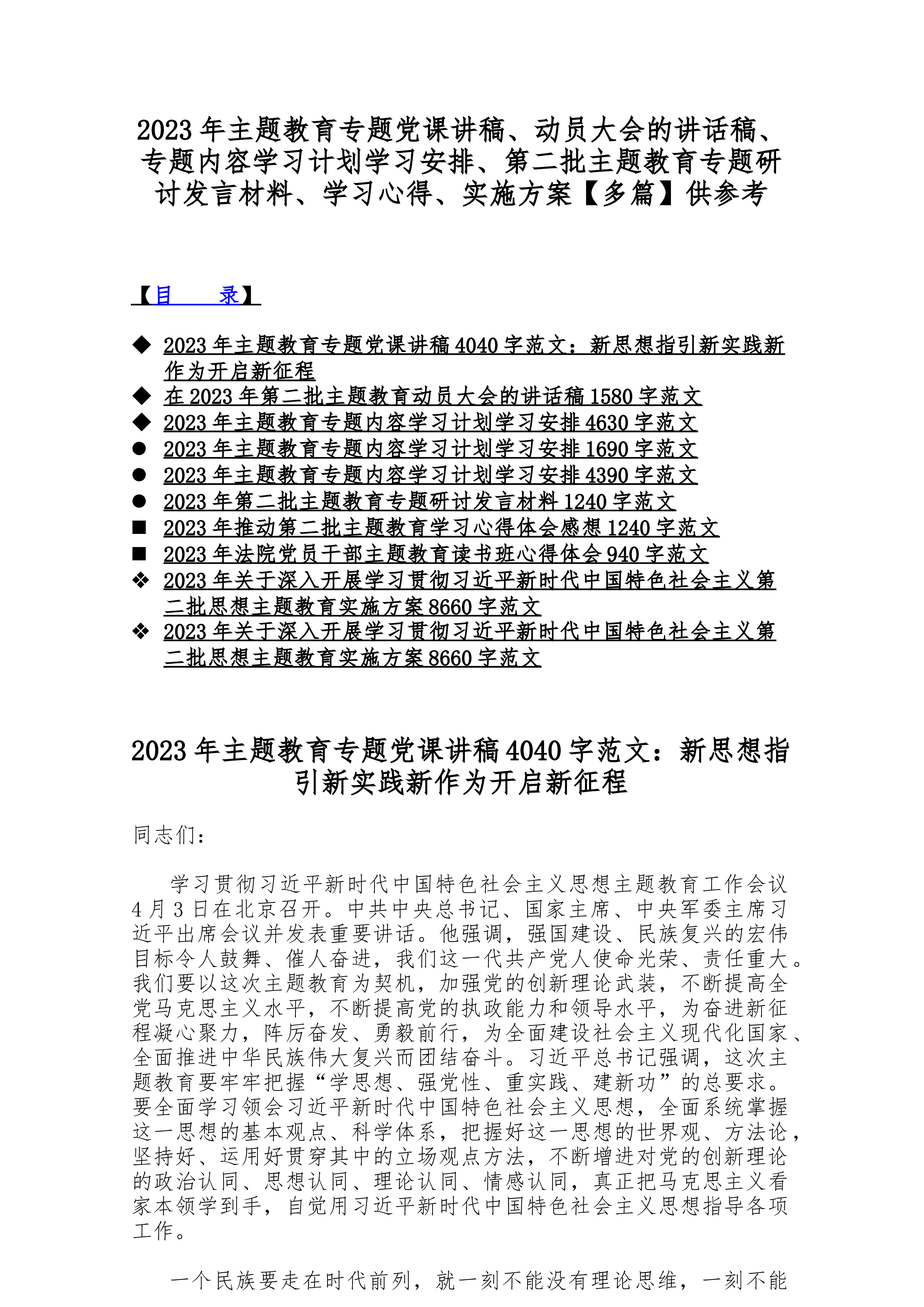 2023年主题教育专题党课讲稿、动员大会的讲话稿、专题内容学习计划学习安排、第二批主题教育专题研讨发言材料、学习心得、实施方案【多篇】供参考