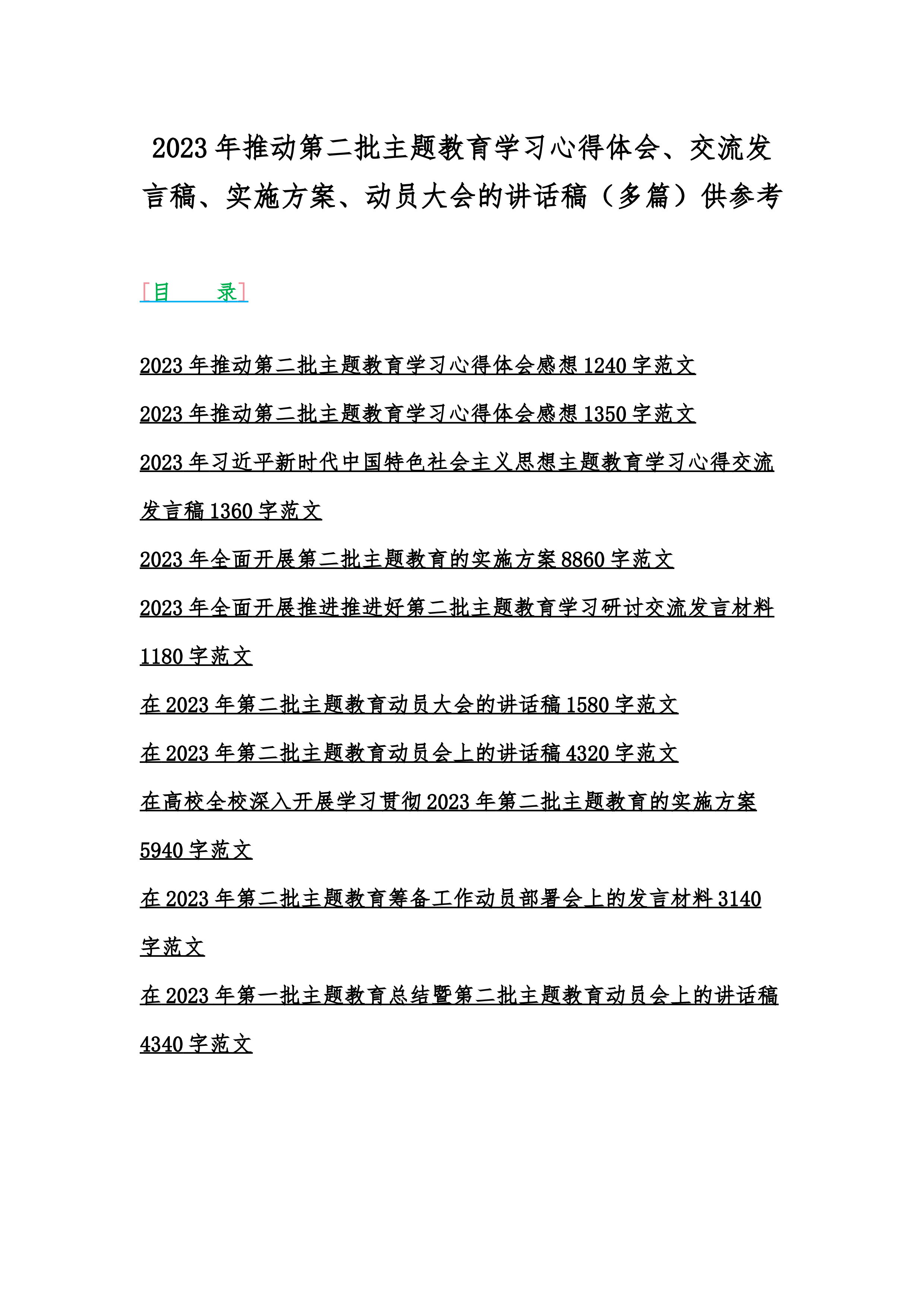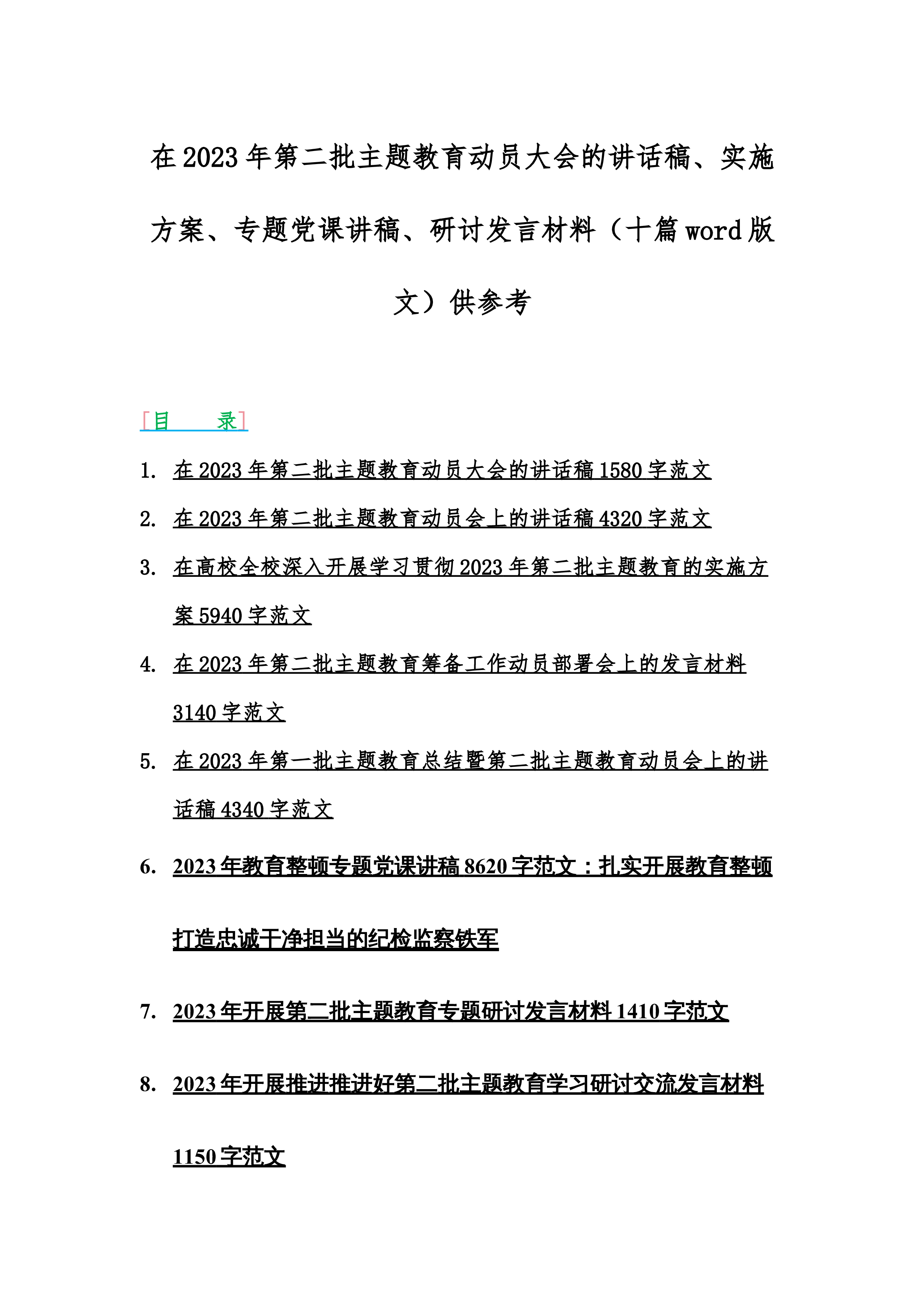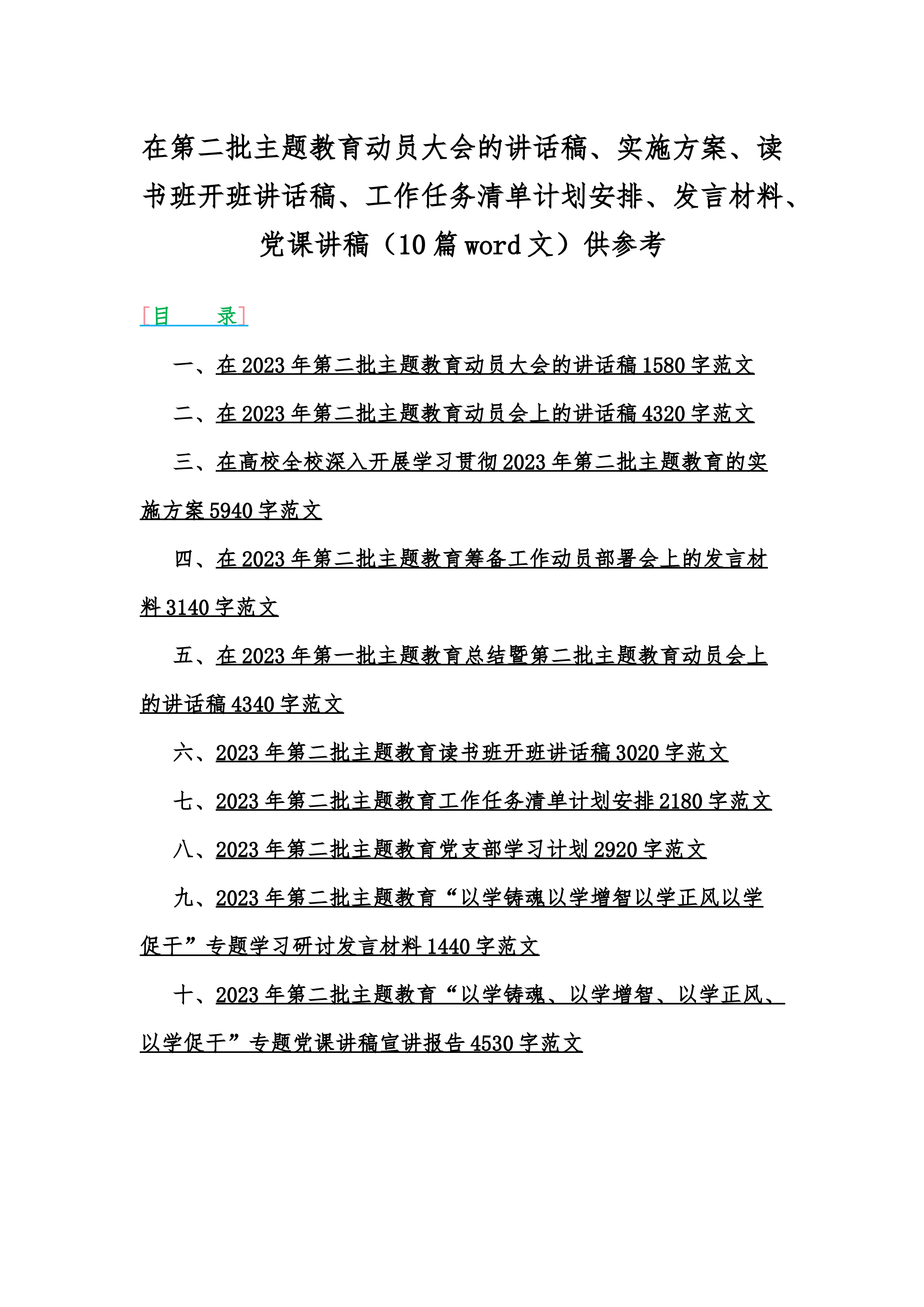 2023年主题教育专题党课讲稿、动员大会的讲话稿、专题内容学习计划学习安排、第二批主题教育专题研讨发言材料、学习心得、实施方案【多篇】供参考