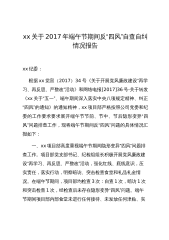 xx关于2017年端午节期间反“四风”自查自纠情况报告xx纪委:根据xx党宣(2017)34号《关于开展党风廉政建设“再学习、再反思、严整改”活动》和网络电报[2017]36号-关于转发《xx关于“五一”、端午期间深入落实中央八项规定精神、纠正“四风”的通知》的通知精神,xx项目部严格按照公司党委和纪委的工作要求要求展开端午节节前、节中、节后隐形变异“四风”问题排查工作,现将端午节期间反“四风”问题的具体情况汇报如下:一、xx项目部高度重视端午节期间隐形变异“四风”问题排查工作。项目部党支部书记、纪检组组长积极开展党风廉政建设“再学习、再反思、严整改”活动,强化红线、底线意识,压实责任,落实行...