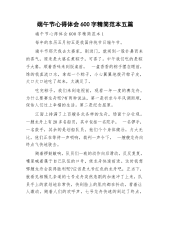 端午节心得体会600字精简范本五篇端午节心得体会600字精简范本1每年的农历五月初五是我国传统节日端午节。端午节那天我去太婆家,刚进门,就闻到一股扑鼻而来的香气,原来是太婆在煮粽子,可香了。中午我们吃的是粽子大餐,顺着香味来到饭桌前,一盘香香的粽子摆在眼前,馋的我直流口水,拿起一个粽子,小心翼翼地拨开粽子皮,大口大口地吃了起来,太满足了。吃完粽子,我们来到电视前,观看一年一度的赛龙舟。为什么要赛龙舟呢?有两种说法,第一是祈求今年风调雨顺,保佑人们过上幸福的生活。第二是纪念屈原。江面上排满了上百艘各式各样的龙舟,场面十分壮观。一艘龙舟上有20多名船员,其中包括一名陀手,一名锣手,一名鼓手,其余的...