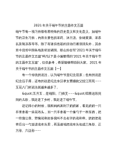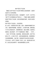 端午节是为了纪念谁【概述】端午节是为了纪念谁为网的会员投稿推荐,但愿对你的学习工作带来帮助。端午节为每年农历五月初五,又称端阳节、午日节、五月节等。“端午节”为中国国家法定节假日之一,下面是小编给大家整理的端午节是为了纪念谁,欢迎大家借鉴与参考,肯定对大家有所帮助。端午节是为了纪念谁1、纪念屈原说据《史记》“屈原贾生列传”记载,屈原,是春秋时期楚怀王的大臣。他倡导举贤授能,富国强兵,力主联齐抗秦,遭到贵族子兰等人的强烈反对,屈原遭馋去职,被赶出都城,流放到沅、湘流域。他在流放中,写下了忧国忧民的《离骚》、《天问》、《九歌》等不朽诗篇,独具风貌,影响深远(因而,端午节也称诗人节)。公元前278年...