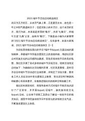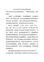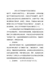 2021端午节文艺演出领导讲话稿2021端午节文艺演出领导讲话稿 尊敬的各位来宾、老年朋友们: 大家好!五月莺歌燕舞日,又到粽味飘香时。在中国的传统节日---端午节到来之际,我们在这里隆重举行进庆祝端午节文艺活动。首先我代表___镇向大家的光临表示热烈的欢迎,向前来参加活动的来宾、老年朋友们致以节日的问候! 端午节,又称端阳节、女儿节、午日节、五月节、艾节、端五、重五、夏节、诗人节等。过端午节,是中国人两千多年来的传统习惯。包括端午节在内的中华传统节日还有春节、清明节、重阳节、中秋节,这些都是我们的节日。它凝聚着我们的民族精神和民族情感,是中华民族文化遗产的重要组部分,是展示和传播优秀民...