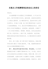 督查室主任在市委办公室2024年重点工作专题推进会上的汇报发言 尊敬的各位领导,同志们: 为助推高质量发展,**市建立经济联合督查工作机制,以经济督查的“大联合”,助力**建设,在中国式现代化建设中展现**作为、作出**贡献。现将有关工作进展情况汇报如下: 一、高位对标、突出重点,谋划“两张清单”精准督。一张决策交办清单,即市委和市政府决策交办事项清单。系统梳理现代化产业体系建设、高水平科技自立自强、南沙开发开放、城乡区域协调发展等目标任务,列出督查清单,制定对各区各部门的滚动督查计划,延伸列出各专题相关的企业、产业园区、在建项目、公共平台等点位清单,使得实地督查重点清晰、一目了然。如围...