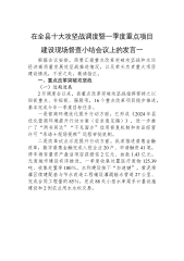 在全县十大攻坚战调度暨一季度重点项目建设现场督查小结会议上的发言一根据会议安排,简要汇报重点改革突破攻坚战和水运经济高质量发展攻坚战推进情况,以及牵头负责重大项目建设情况,不妥之处,敬请指正。一、重点改革突破攻坚战(一)近期进展2月调度会以来,县重点改革突破攻坚战指挥部持之以恒抓重点、补短板、强弱项,16个重点改革项目稳步推进,基本完成今年一季度目标任务。一是营商环境优化提升行动方面。已形成《2024年县优化营商环境提升行动方案(征求意见稿)》,进一步推广了“两书同达”“不见面办”信用修复机制和食品经营许可“承诺+现场视频”远程审批机制。二是改革试点示范提升行动方面。纵深推进普惠金融改革,数字...