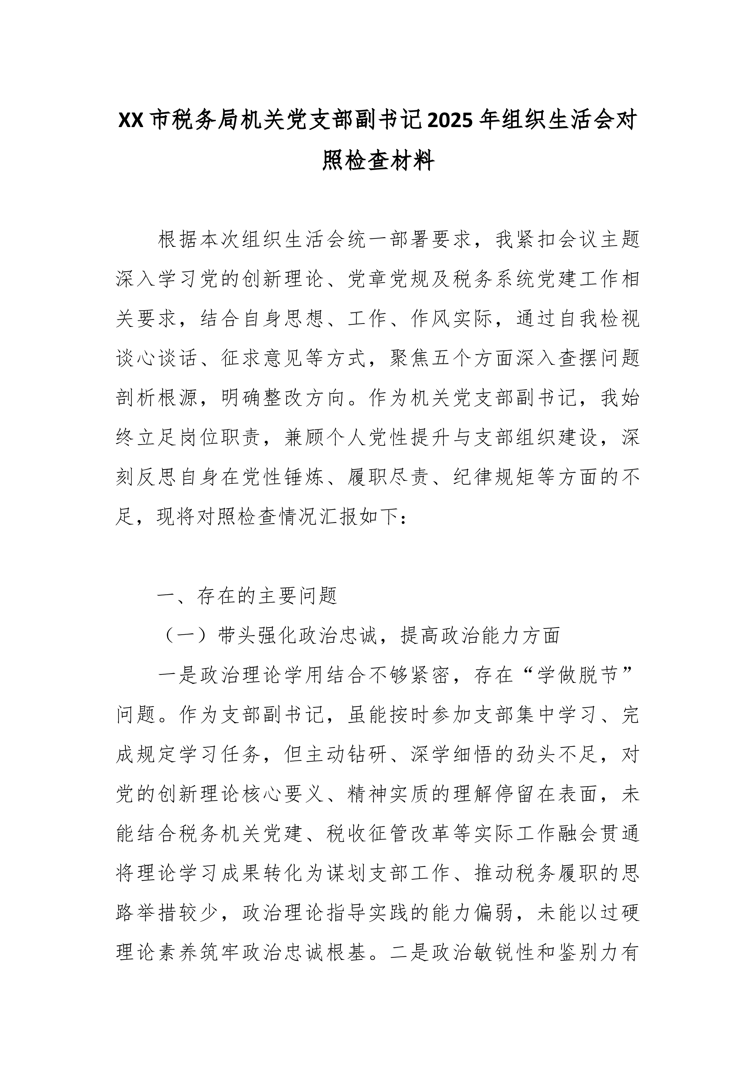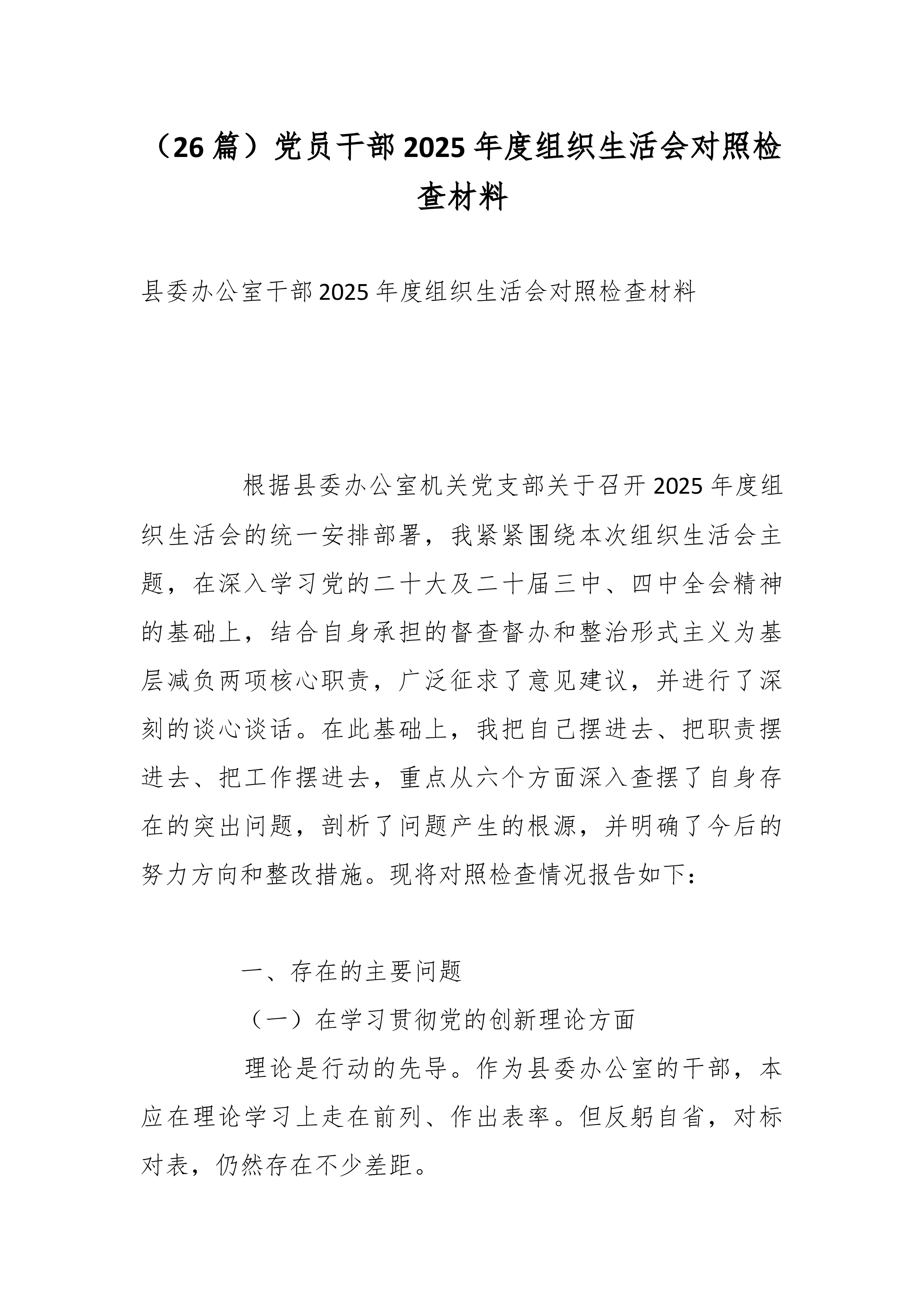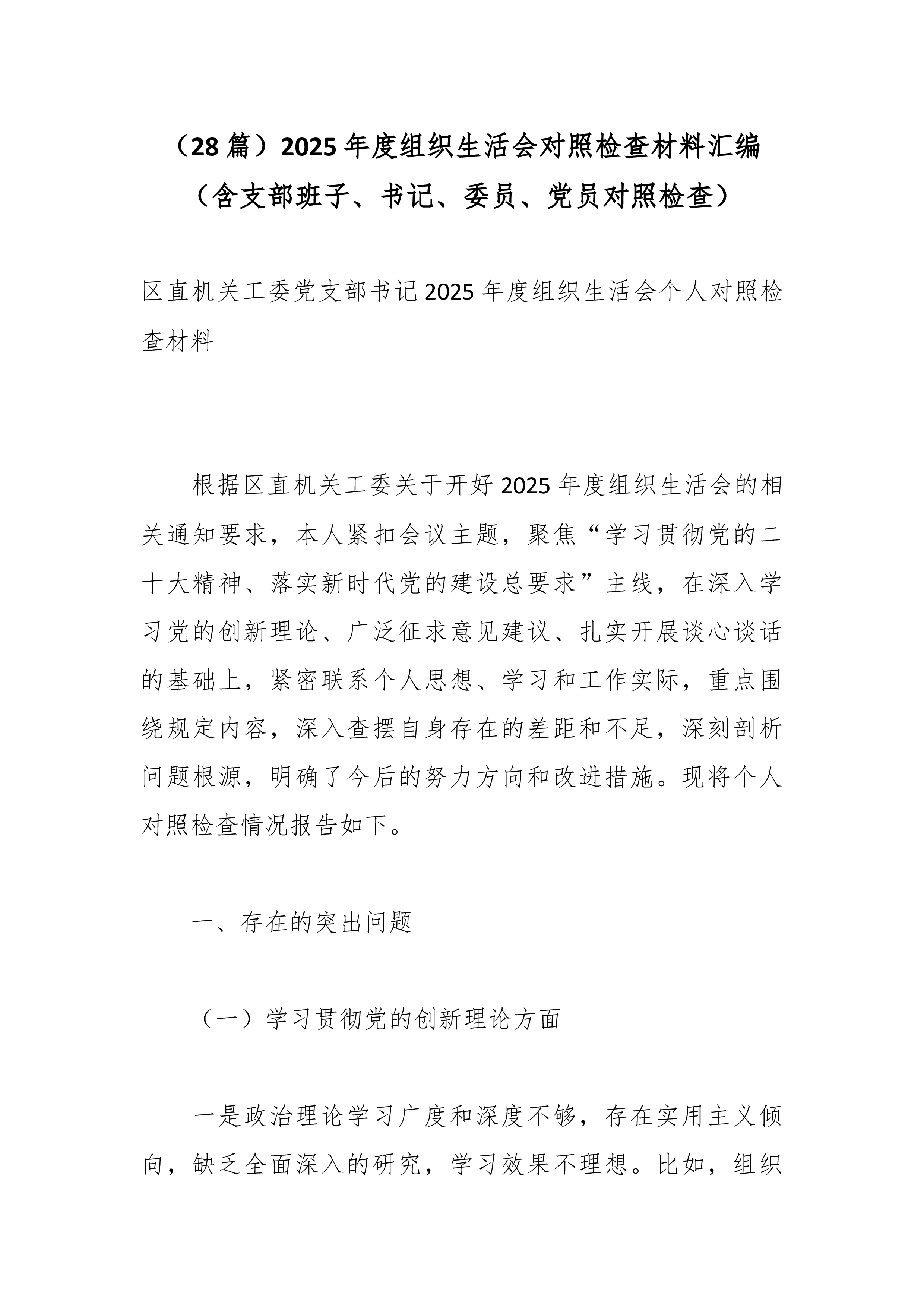 (28篇)2025年度组织生活会对照检查材料汇编(含支部班子、书记、委员、党员对照检查)区直机关工委党支部书记2025年度组织生活会个人对照检查材料 根据区直机关工委关于开好2025年度组织生活会的相关通知要求,本人紧扣会议主题,聚焦“学习贯彻党的二十大精神、落实新时代党的建设总要求”主线,在深入学习党的创新理论、广泛征求意见建议、扎实开展谈心谈话的基础上,紧密联系个人思想、学习和工作实际,重点围绕规定内容,深入查摆自身存在的差距和不足,深刻剖析问题根源,明确了今后的努力方向和改进措施。现将个人对照检查情况报告如下。 一、存在的突出问题 (一)学习贯彻党的创新理论方面 一是政治理论学习广度和深度不够,存在实用主义倾向,缺乏全面深入的研究,学习效果不理想。比如,组织支部学习,虽然严格落...