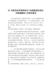 XX市防汛抗旱指挥部关于加强基层防范应对极端暴雨工作指导意见为突出避险为要,国家防办制定了《关于加强基层防范应对极端暴雨工作的指导意见》(以下简称指导意见),为抓好指导意见的贯彻落实,市防办对8项工作进行了任务、责任分解,请结合工作实际,进一步细化实化工作措施,确保指导意见明确的工作事项,件件有措施,事事能落地。一、突出抓好暴雨防范基层包保责任到岗到位。当预报有暴雨可能造成洪涝灾害时,相关区域防汛包保责任人特别是包乡包村干部要提前下沉一线,督促指导责任区、联系点,做好人员转移避险、重点部位巡查、抢险救援救灾等工作,协助当地解决实际困难。(责任分工:各县(区)防指要及时督导辖区责任人上岗到位,履...