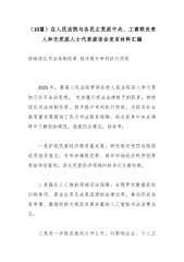 (10篇)在人民法院与各民主党派中央、工商联负责人和无党派人士代表座谈会发言材料汇编持续深化司法体制改革稳步提升审判执行质效 2025年,最高人民法院带领各级人民法院深入学习贯彻习近平法治思想,忠实履行宪法法律赋予的职责,持续深化司法体制改革,稳步提升审判执行质效,为经济社会高质量发展提供了有力司法服务保障。结合民革中央在调研中了解到的情况,我提四点建议,供参考: 一是护航民营经济高质量发展。研究制定惩罚性赔偿适用指导意见,发布涉腐败犯罪、破坏市场经济秩序犯罪等指导性案例,深化民营经济领域纠纷多元化解机制。 二是强化人工智能领域司法保障。合理界定数据获取训练使用、算法应用及成果流通的法律边界,推动形成包容审慎、激励创新与规范发展并重的人工智能司法治理生态。 三是进一步规范裁判文书公开...