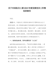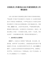 区直机关工作委员会2025年度发展党员工作情况报告为深入践行新时代党的建设总要求与新时代党的组织路线,严格依照《中国共产党发展党员工作细则》及《全国党员教育培训工作规划》的部署安排,中共**区直机关工作委员会始终将发展党员工作视为机关党建的源头工程与基础性任务,常抓不懈。2025年度,工委坚守政治标准,严格规范操作流程,聚焦提升质量与效率,在发展党员工作的标准化、规范化、制度化建设上开展了一系列探索与实践,取得了一定成果,同时也发现了一些亟待解决的问题。现将相关情况报告如下。一、基本情况与主要举措2025年,区直机关工委秉持“控制总量、优化结构、提高质量、发挥作用”的总体要求,以高度的政治责任感与严谨细致的工作态度,扎实推进发展党员各项工作。截至2025年10月,区直机关各级党组织共发展预备...